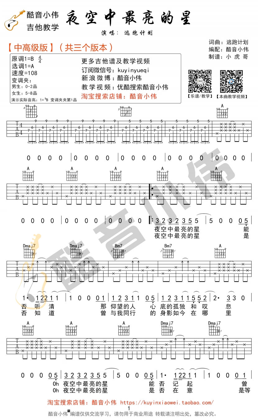 曲谱介绍: 夜空中最亮的星吉他谱,逃跑计划乐队演唱,本曲谱为中高级原版编配,三张图片谱例。每一个深夜,你是否都会期待看到一颗星?逃跑计划乐队的一首《夜空中最亮的星》唱出的既有我们对理想和自由的追逐,也有对青春的迷惘和信仰。歌曲原调B选调A,变调夹男生0-2品女生5-8品,夜空中最亮的星吉他弹唱教学视频演示实际音高是bB调,变调夹夹一品。