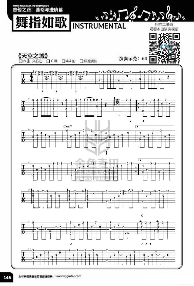 曲谱介绍: 天空之城吉他指弹谱,曲谱编配王坚老师说:《天空之城》吉他演奏的版本很多,有的改编很易弹但听起来太过简陋,有的改编很好听却因使用特殊调弦,使指法和背谱都增加了困难,这首《天空之城》是我改编地标准调弦版本,在改编中力求“简单好听,而不简陋的原则”。虽然这首曲子是初级曲目,但真正弹好听和走心其实不易,为此我看了多遍《天空之城》电影,力图让自己的演奏中有更多的画面表达,在录制过程中更是体会到“简单的音符,需要最艰苦练习”这句话的含义,艺无止境,音乐演奏中最大的快乐就是能够看到自己一天天的在进步地过程里。我希望用自己的努力给学生们一个更好的演示范本。
