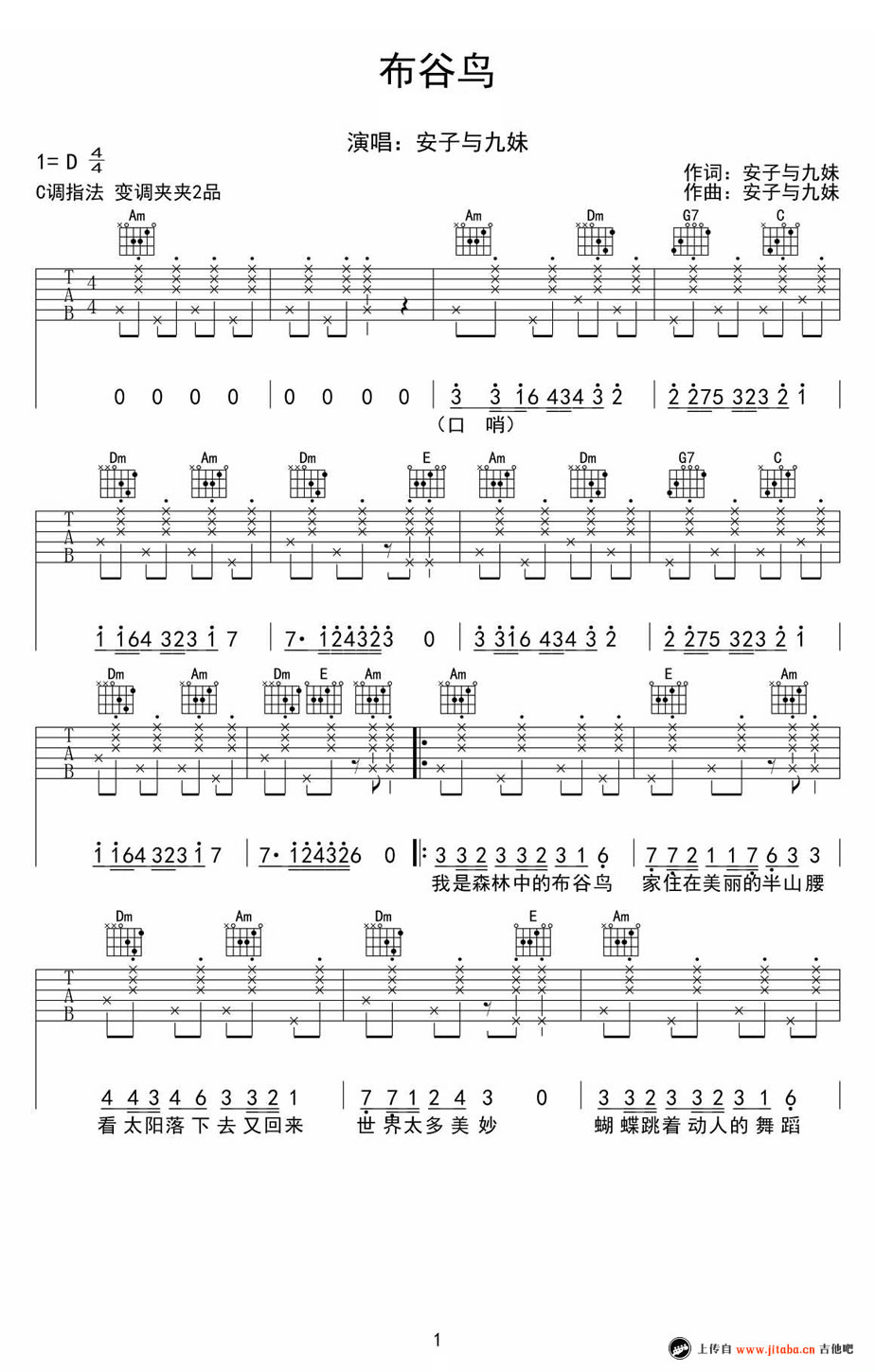 曲谱介绍: 安子与九妹《布谷鸟》吉他谱,原调D调,C调指法,变调夹夹第二品。布谷鸟吉他六线谱,高清版共四张图片谱例,分两页浏览。轻快的节奏,欢乐的口哨,完美的和声,听着听着心情也明亮了, 在沉郁和爱情泛滥的民谣中,安子与九妹的布谷鸟可谓是一朵奇葩,那欢快的旋律,清爽的歌词,不就是一直所向往的无忧无虑吗?