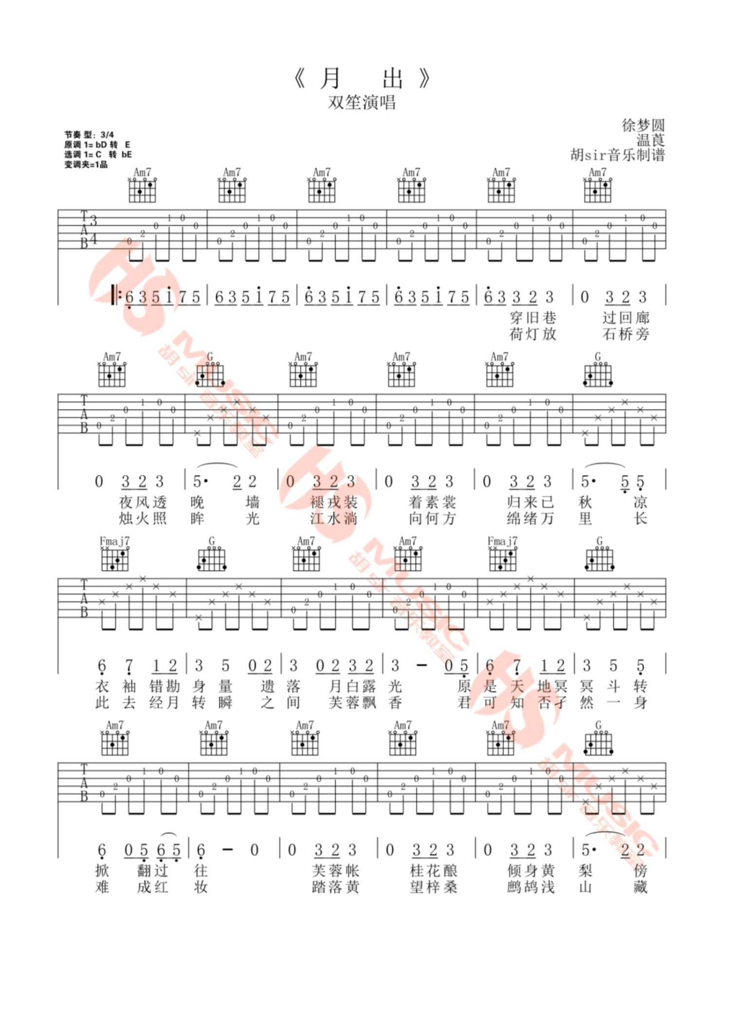 月出吉他谱 - 双笙 - C调吉他弹唱谱 - 古风歌曲