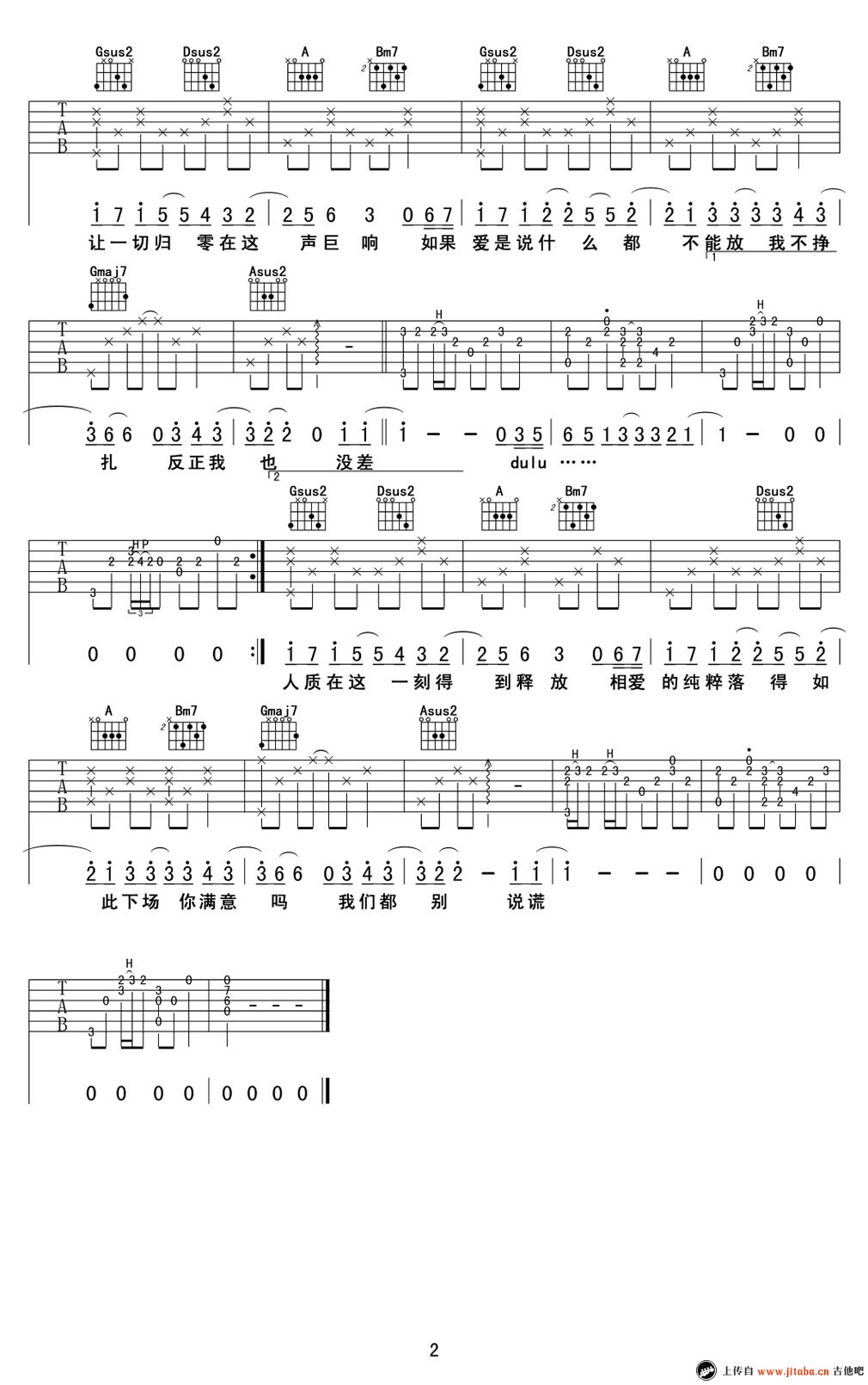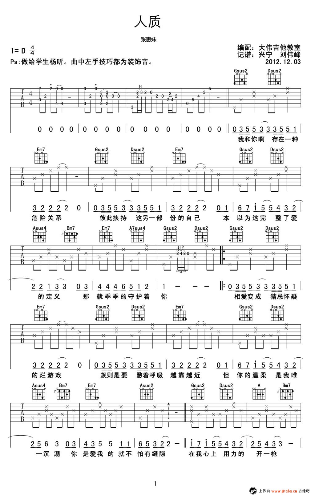 曲谱介绍: 张惠妹《人质》吉他弹唱谱,采用D调指法编配,共有2张高清图谱,免翻页排版设计。