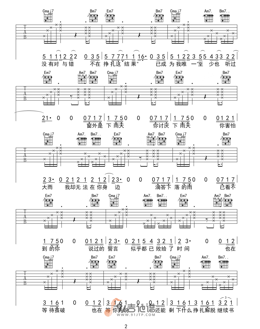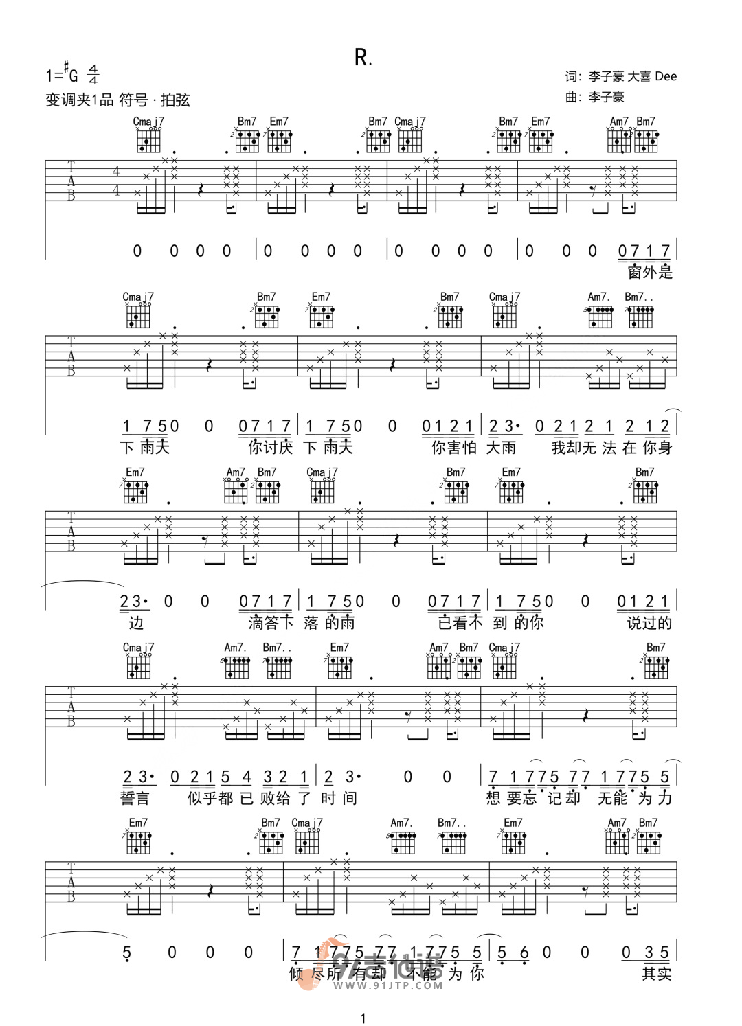 曲谱介绍: 曲谱简介:R.吉他谱,李子豪演唱的一首歌曲,4/4拍的节奏,这首歌曲的原调为降A调,这里曲谱采用了G调指法进行编配,演唱时夹变调夹1品可回到原调,也可根据个人实际嗓音情况选择。曲谱由琴谱网更新上传,共4张高清图片弹唱吉他谱例,曲谱来源于网络转载,编配制谱者暂不详。窗外是下雨天,你讨厌下雨天,你害怕大雨,我却无法在你身边。分开之后,我还是会记得你讨厌下雨天。今天又下雨了,可我再也不能为你撑伞了。