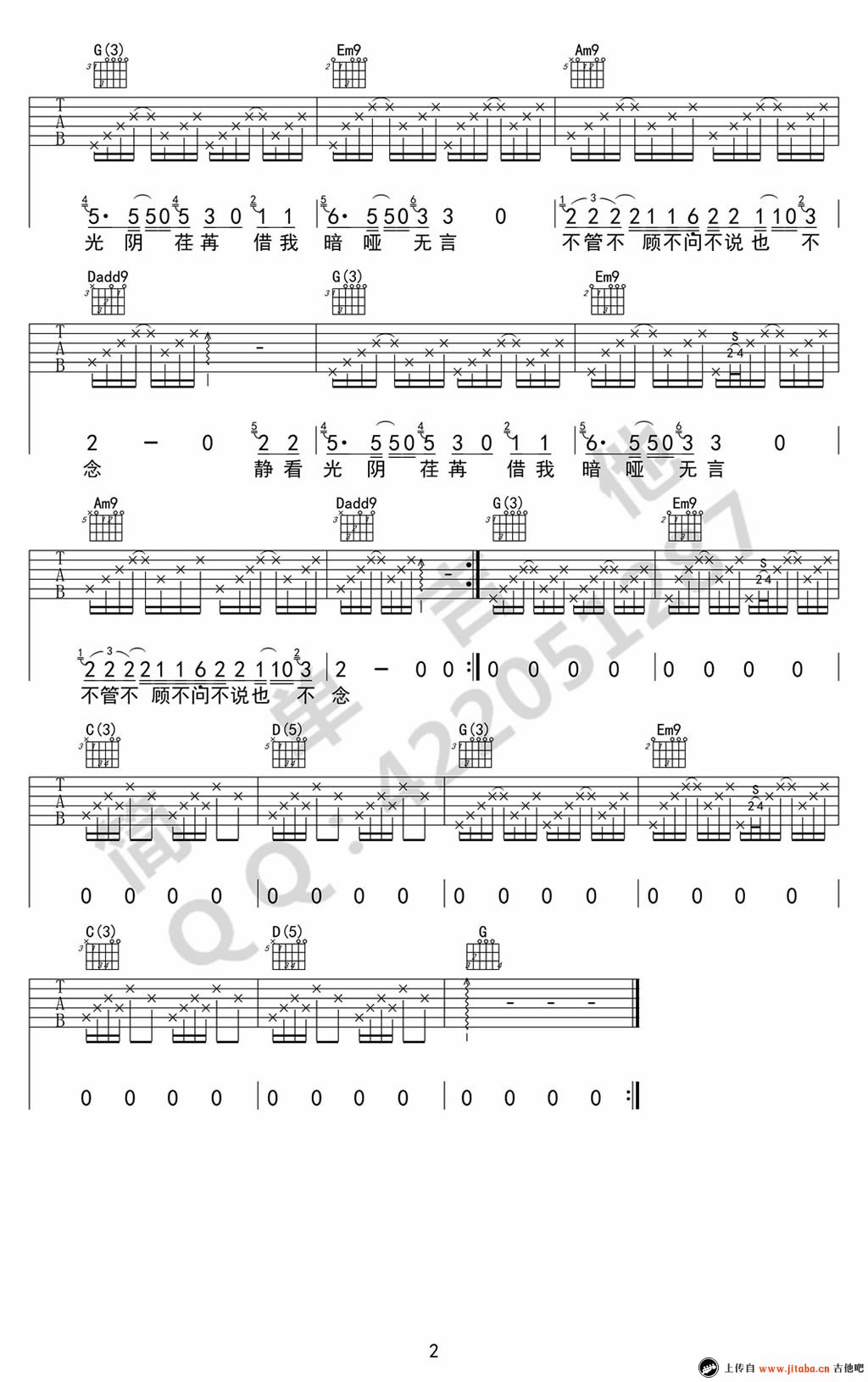 曲谱介绍: 谢春花《借我》吉他谱,G调编配,变调夹夹四品,借我吉他弹唱谱,简单吉他编配,图片谱高清版。这是谢春花个人首张专辑《算云烟》中的第二首歌,今年听过的最让人心醉的民谣,歌词中一句“静看光阴荏苒,不管不顾不问不说也不念”,旋律淡淡,歌词简单却深邃,声音平静悠扬,如同在耳边慢慢倾诉。细细聆听,竟愁肠百转,不知所然。借我十年,借我青春年华与年少情怀。 谢春花 借我吉他六线谱 谢春花《借我》吉他谱 弹唱六线谱