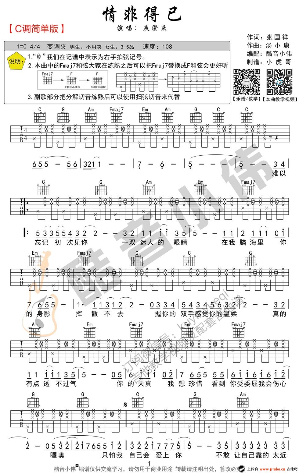 曲谱介绍: 庾澄庆演唱的《情非得已》吉他谱,C调简单版,男女生通用,男生不用夹变调夹,女生3-5品,曲谱弹奏右手拍弦记号、和弦转换琴友们见图片谱说明。情非得已吉他谱,感谢小伟老师编配并为大家带来弹唱教学讲解。台湾偶像剧《流星花园》主题曲,传唱至今的经典。