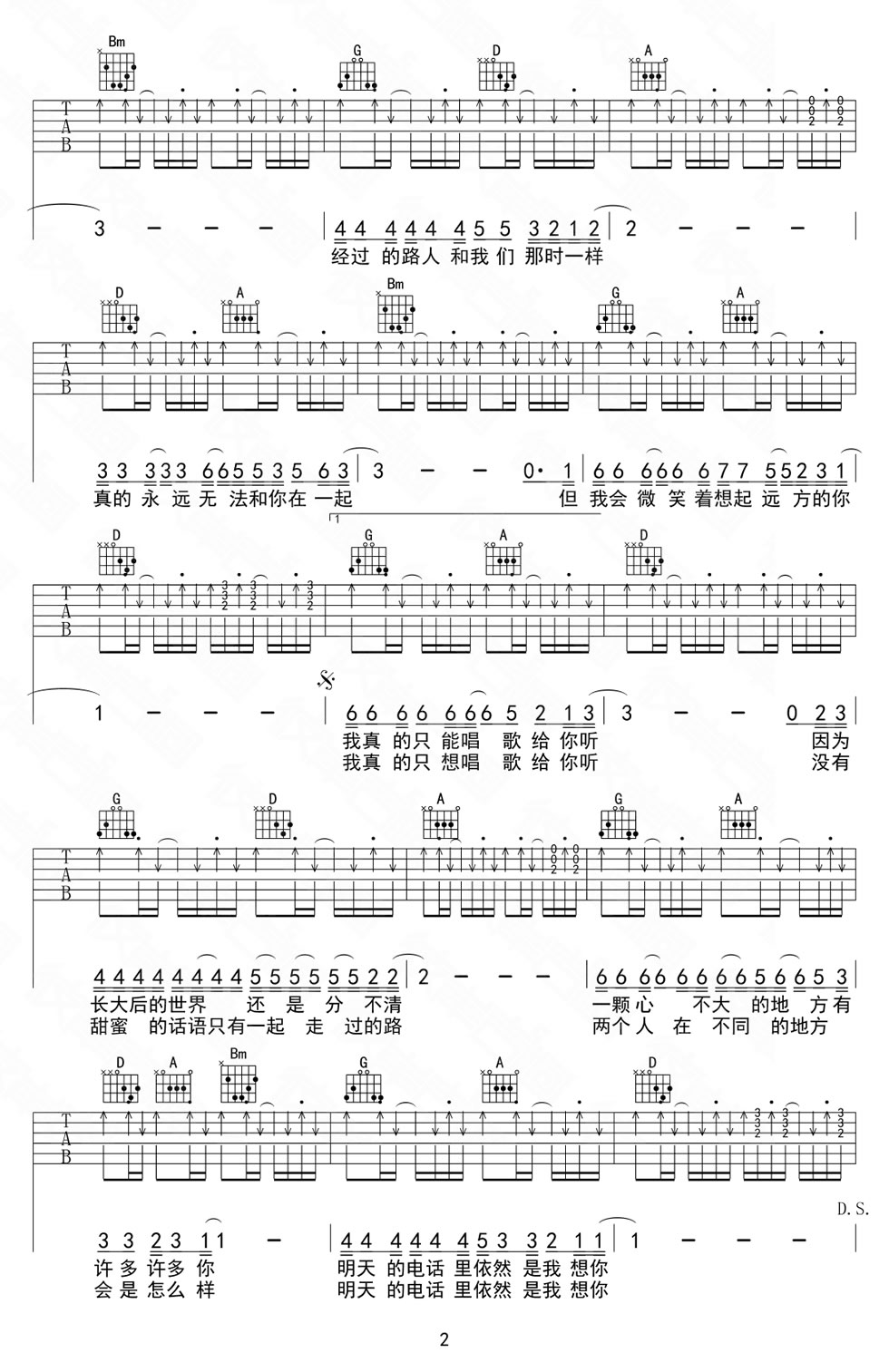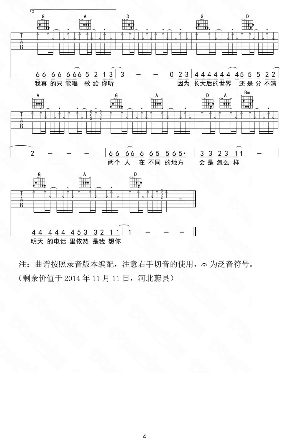 曲谱介绍: 宋捷演唱的《我会想起你》吉他谱,D调指法六线谱,我会想起你吉他谱,男生版弹唱谱,旋律更舒缓,完整版共四张图片谱子。曲谱根据录音版本编配,注意右手切音的使用。轻快的词曲会想到阳光、温暖、浪漫,渐渐听地,一种莫名的伤感涌上心头,“真的永远无法和你在一起 但我会微笑着想起远方的你”,此刻已经明白,这是一支回忆的歌,思念、不舍、孤单,会轻触你的泪腺,是否会想起自己曾经的那个她?
