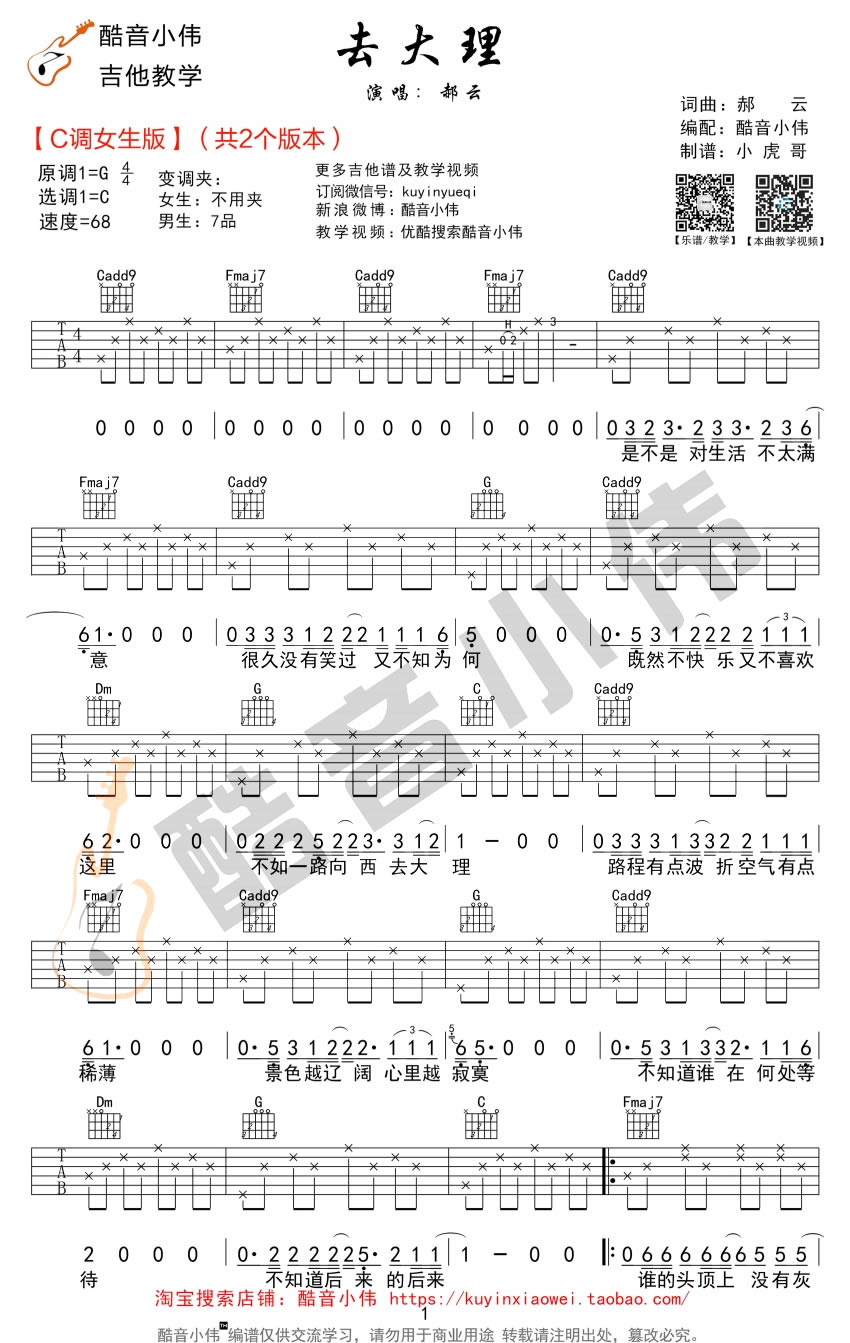 曲谱介绍: 郝云去大理吉他谱,C调女生版,去大理吉他谱,原调G,选用C调编配,本曲谱省略了些右手的伴奏音型,使得弹奏更加简单,随谱附上酷音小伟老师带给大家的《去大理》弹唱教学,具体讲解参考视频。