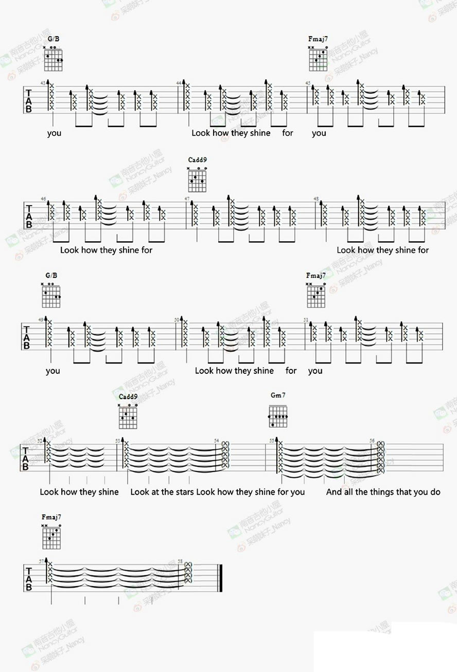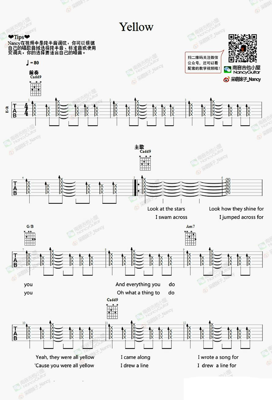 曲谱介绍: Yellow吉他谱,Coldplay演唱,一首英式摇滚带来的温暖与震撼。Yellow吉他弹唱六线谱,酷玩乐队的代表作品,nancy老师在教学视频中是降半音调弦,琴友们可以根据自己的唱歌音域选择降半音、标准音或使用变调夹,选择要适合自己的嗓音。这首歌的中文版是由郑钧演唱的《流星》,台湾偶像剧《流星花园》中 一首主题曲。