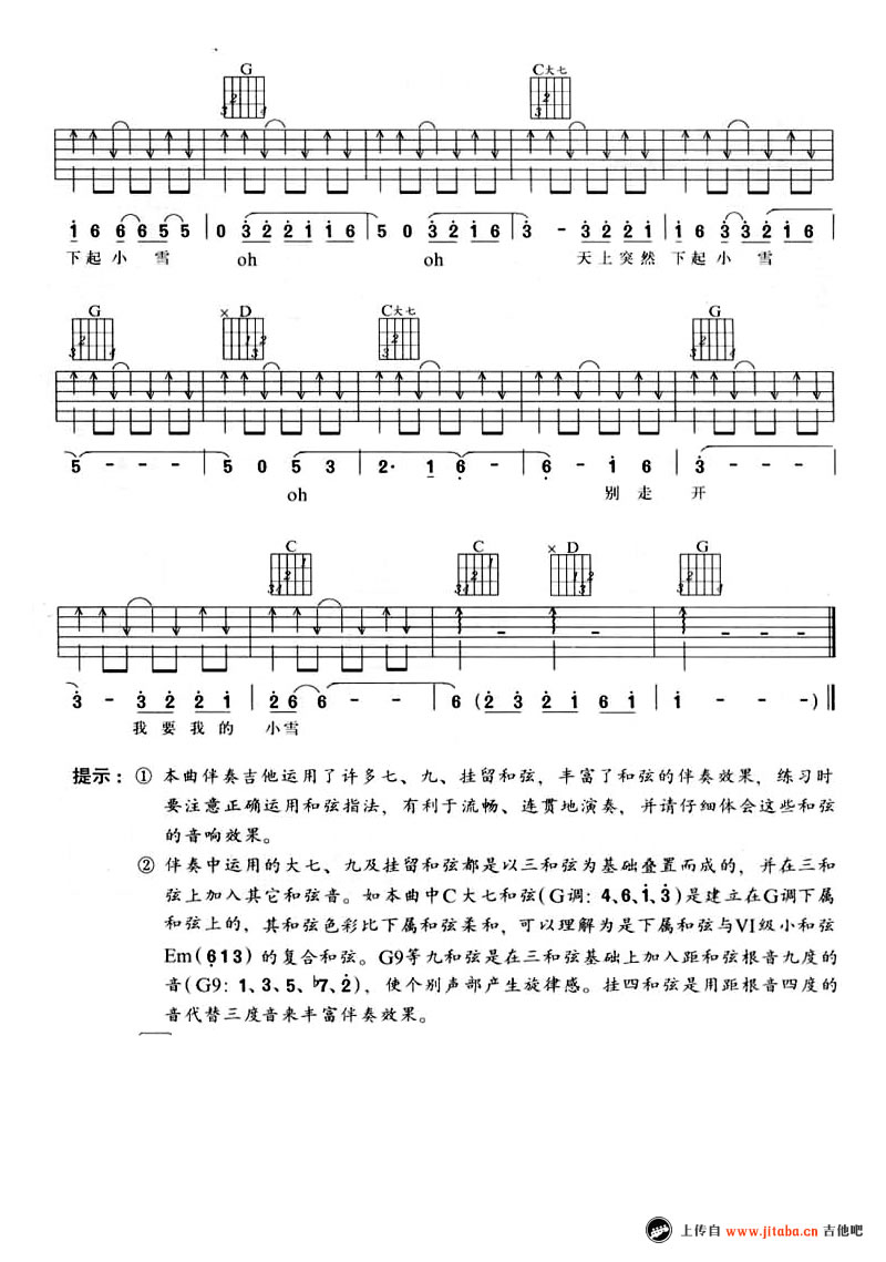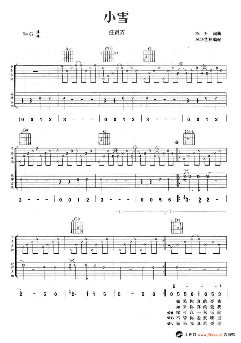 曲谱介绍: 小雪吉他谱,陈升词曲任贤齐演唱的一首经典老歌。小雪吉他六线谱,G调编配,完美版弹唱谱。中国新歌声节目学员杨山的演唱,让这首动听的情歌重新拉回我们的初恋时的记忆。纯净清澈辽阔,仿佛清风扑面而来,让人回味无穷。
