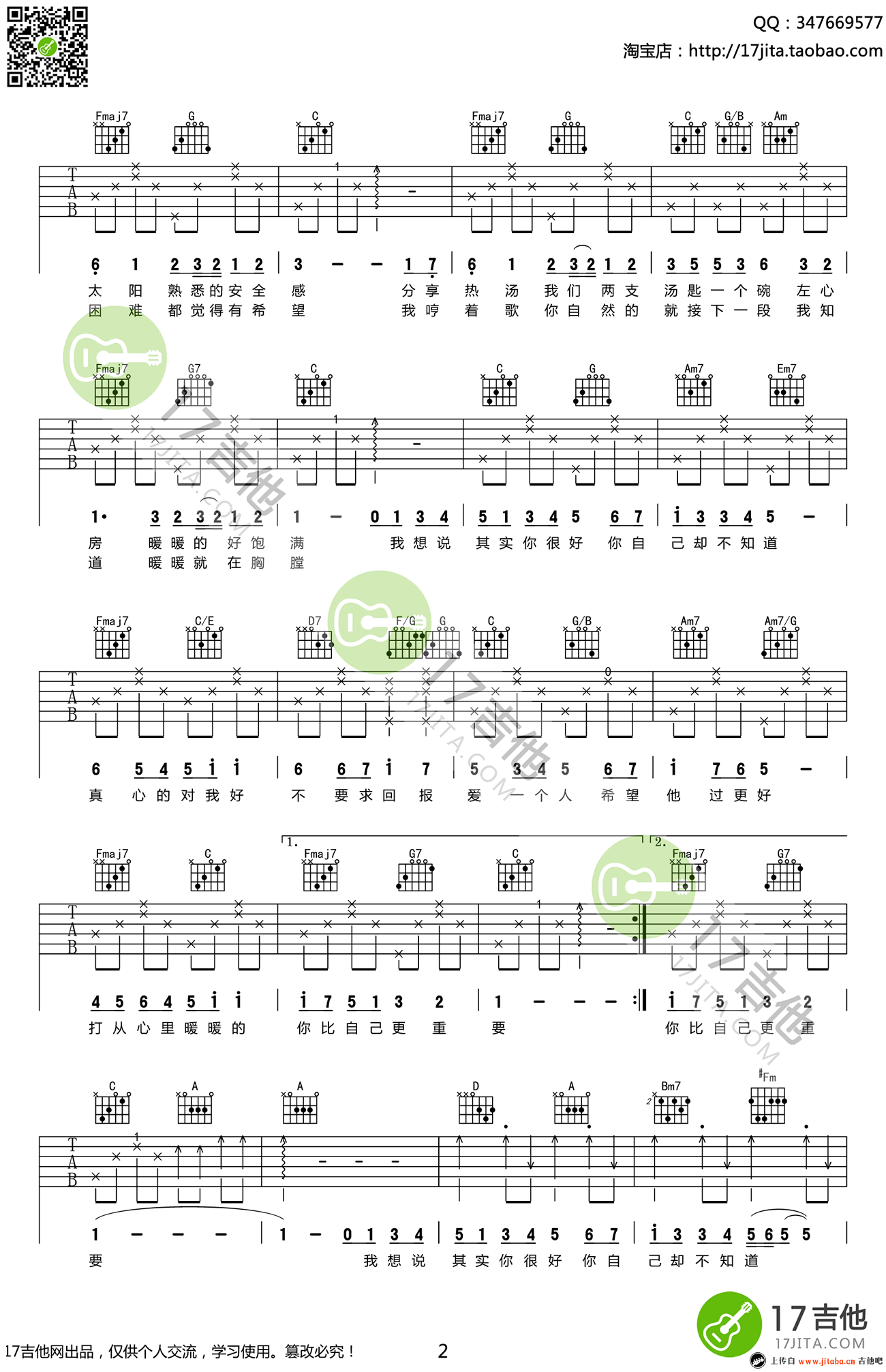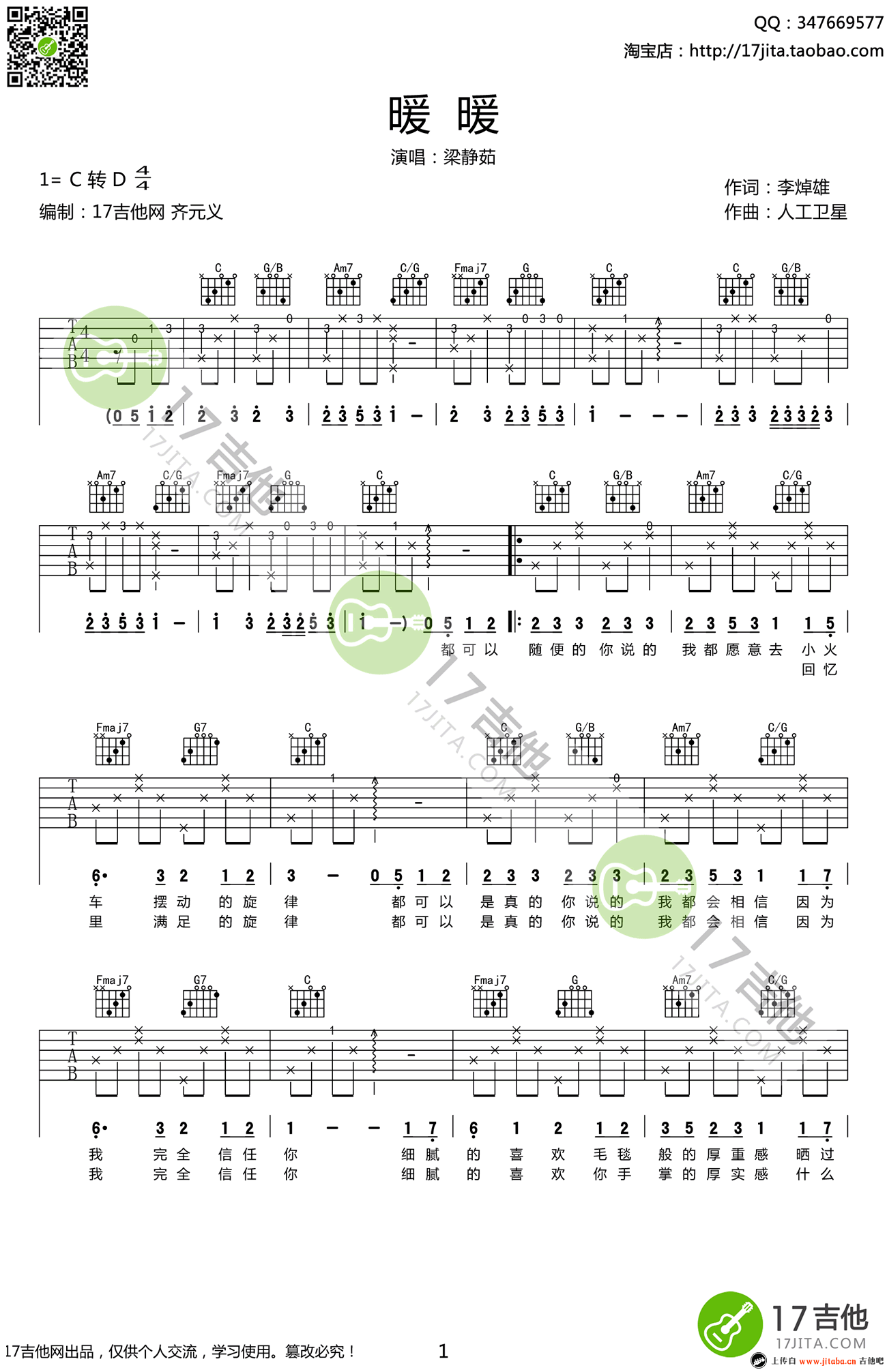 曲谱介绍: 暖暖吉他谱,梁静茹演唱的一首经典告白情歌,弹唱C转D调,暖暖吉他六线谱,三张图片谱。温暖的歌曲,甜蜜贴心的唱出平凡的爱情,给人幸福的感觉。