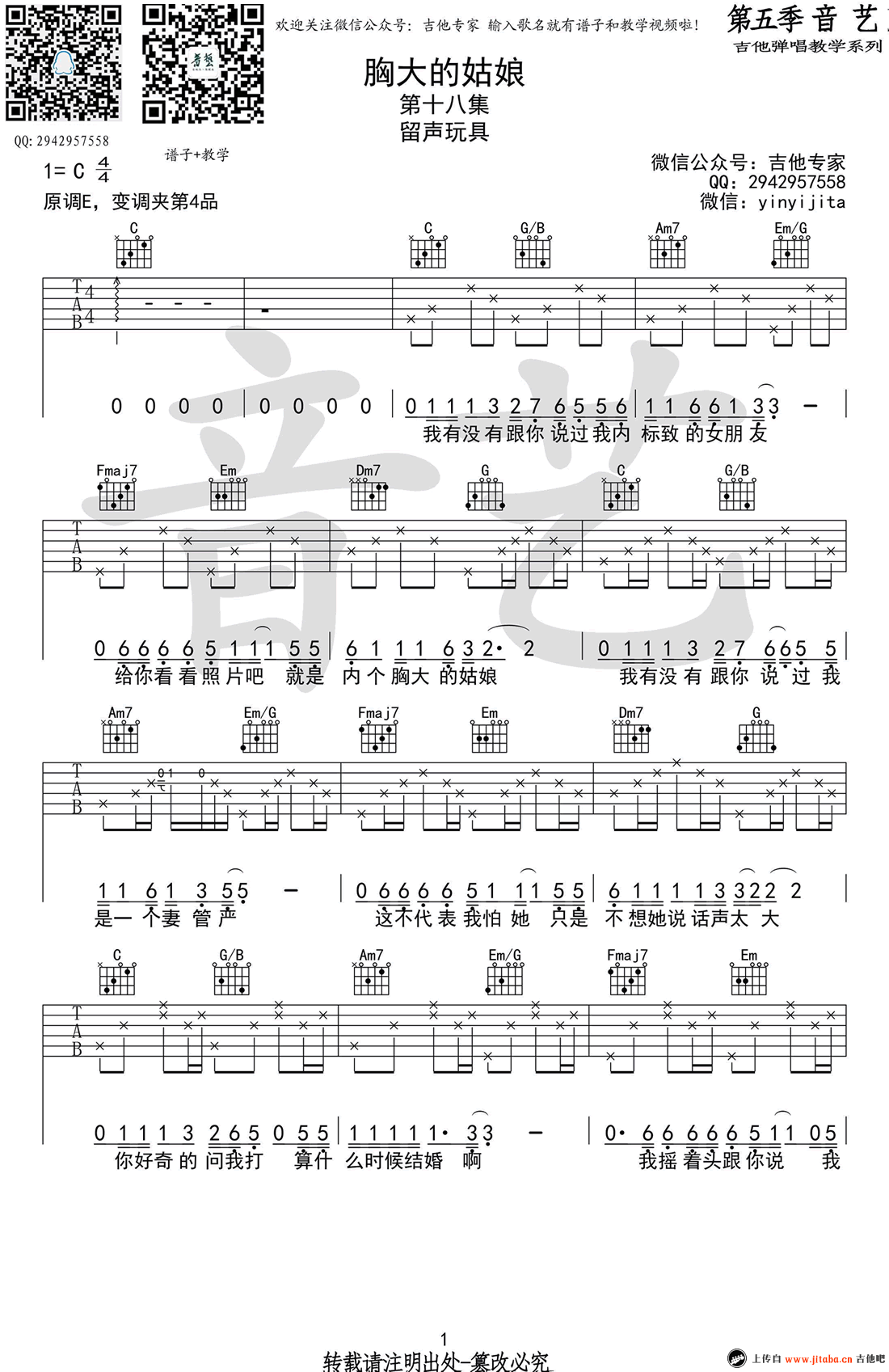 曲谱介绍: 胸大的姑娘吉他谱,原版弹唱谱,原调E,变调夹夹四品,选C调编配。独立民谣音乐人,留声玩具演唱的《胸大的姑娘》吉他六线谱,高清图片谱。不要被这赤裸裸的歌名所击退,这首歌的旋律跟歌词其实都很让人心碎,有故事的人写出有故事的歌,让那些有故事的人自己对号入座!