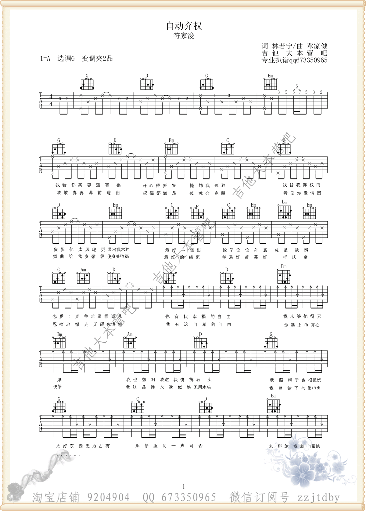 曲谱介绍: 自动弃权吉他谱,符家浚演唱的一首粤语歌曲,自动弃权吉他六线谱,两张图片谱,原调A选调G,变调夹夹第二品。 有一种爱「不一定要拥有才叫幸福, 放手祝福对方令她/他们幸福」也算是一种退而求其次的伟大爱情。 符家浚的《自动弃权》唱出那份无法形容的伤痛及不舍之情。即使多爱一个人, 也要按捺自己的情感决定将双手放开, 希望对方能够找到另一个更心爱她的人。