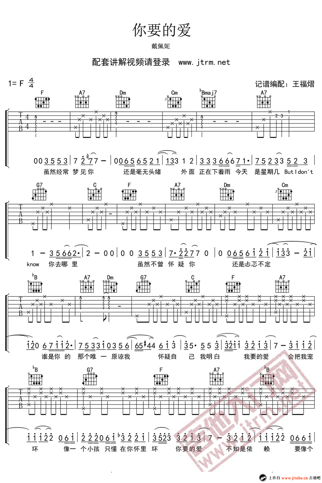 曲谱介绍: 戴佩妮《你要的爱》吉他谱,F调高清弹唱谱,一首勾起人回忆的老歌,当年《流星花园》的片尾曲。你要的爱吉他六线谱,三张图片谱,感谢王福熠老师编配并带来《你要的爱》吉他弹唱的配套教学视频。总有这么一段旋律在我们各自的脑海里盘旋。它是喜或是悲,只有尝过的人才会真的懂,感觉就像是在为自己的某一段爱情故事作旁白, 那些年,我们追过的流星花园。