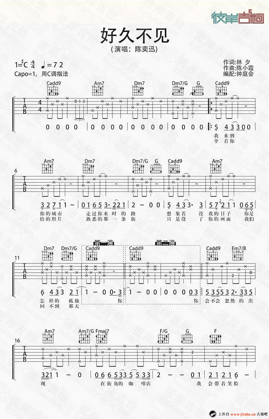 曲谱介绍: 陈奕迅《好久不见》吉他谱,原调#C调,CAPO夹一品选用C调指法,好久不见吉他六线谱,两张图片谱,随谱附上李子阳Cover 吉他弹唱MV,用歌声陪你一起回忆那个好久不见的人。感谢钟庭会编配,彼岸吉他和飞猴乐器出品。好久不见吉他弹唱,诉说恋人分手几年后内心深处的缅怀和忧伤。