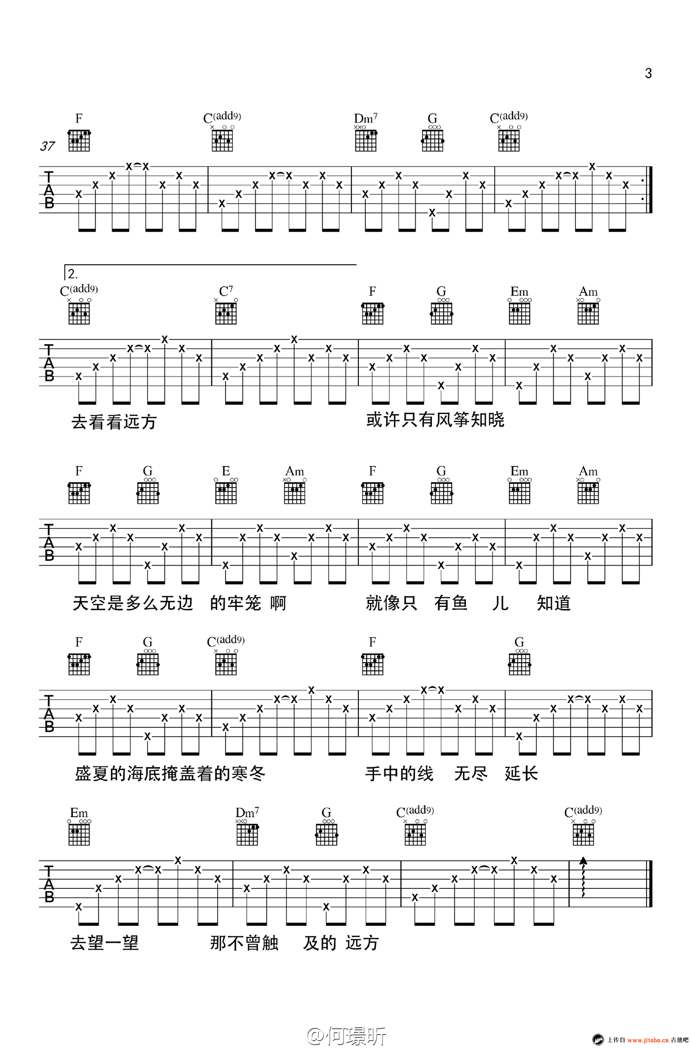 曲谱介绍: 何璟昕演唱,风筝吉他谱,六线谱原版编配,恬淡踏实地有着自己的音乐梦想的女孩,何璟昕的众筹歌曲专辑《向光性》里,一首好听的民谣歌曲,清澈的女声唱出宁静和平和。风筝吉他弹唱谱,三张图片谱。 手中的线无尽延长,去望一望那不曾触及的远方,挣脱那线的束缚啊,是风筝的最初梦想。风筝吉他版,91吉他谱推荐分享。