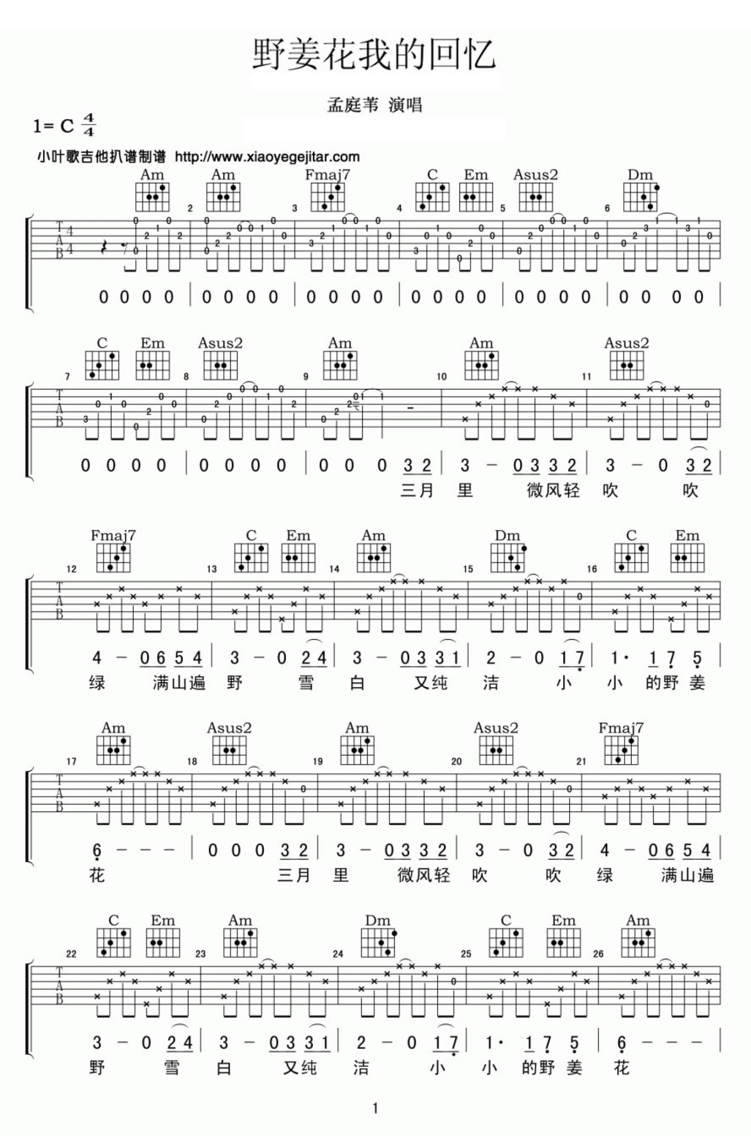 野姜花我的回忆吉他谱 - 孟庭苇 - C调吉他弹唱谱