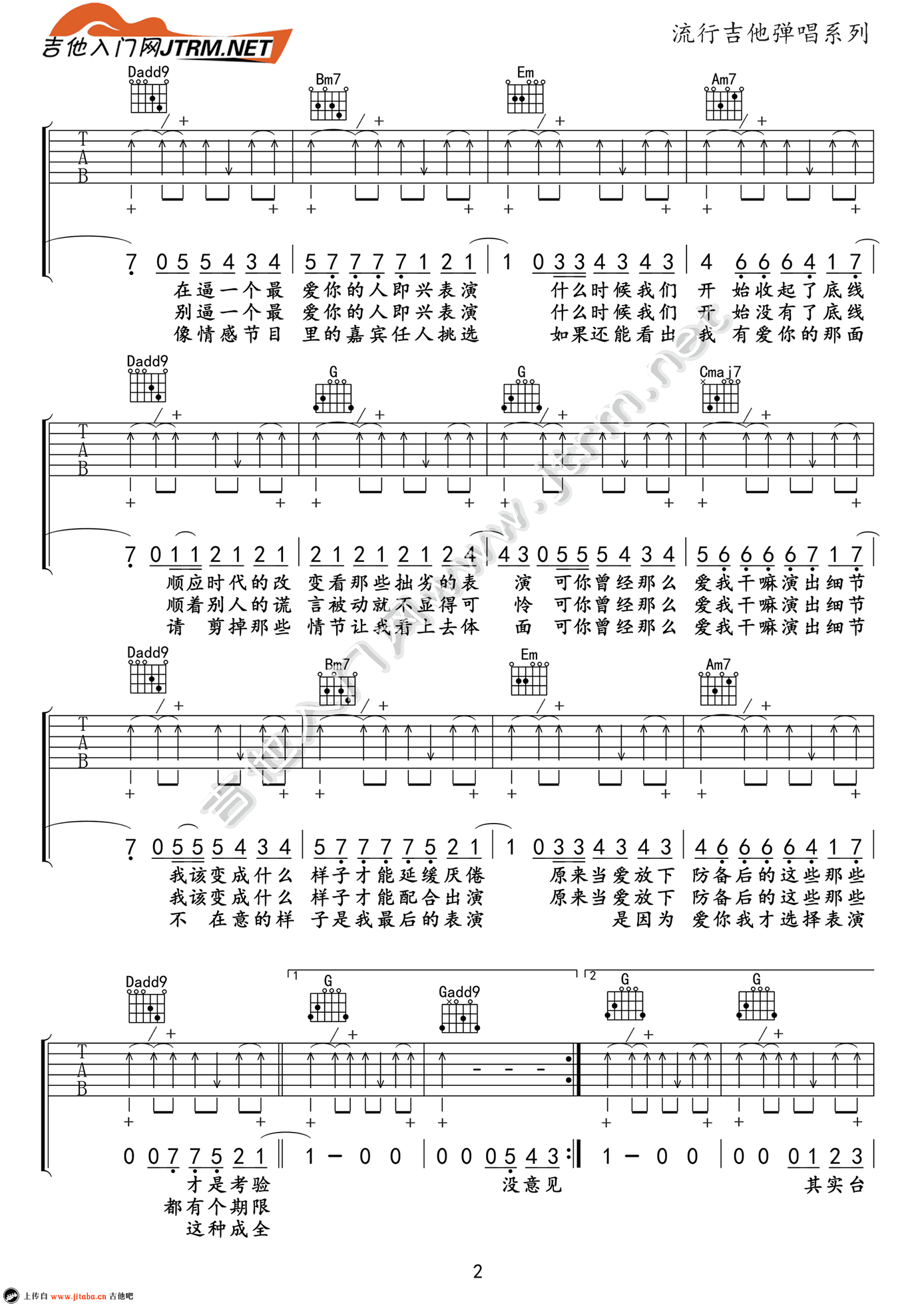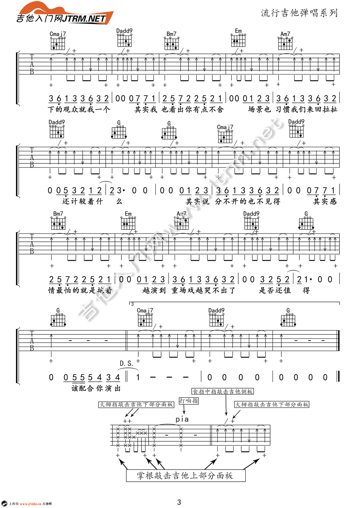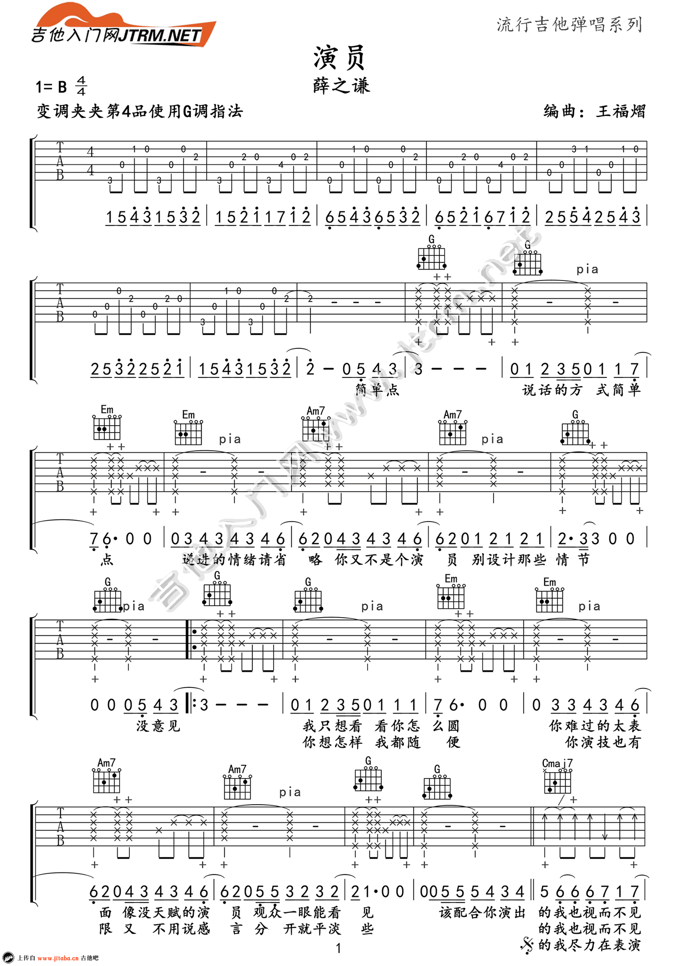 曲谱介绍: 薛之谦《演员》吉他谱,吉他弹唱指弹技巧版,原调B,变调夹夹四品,使用G调指法,演员吉他六线谱,图片谱高清版,感谢福艺吉他编配分享,随谱附上王福熠老师带给琴友们的吉他示范演示视频。