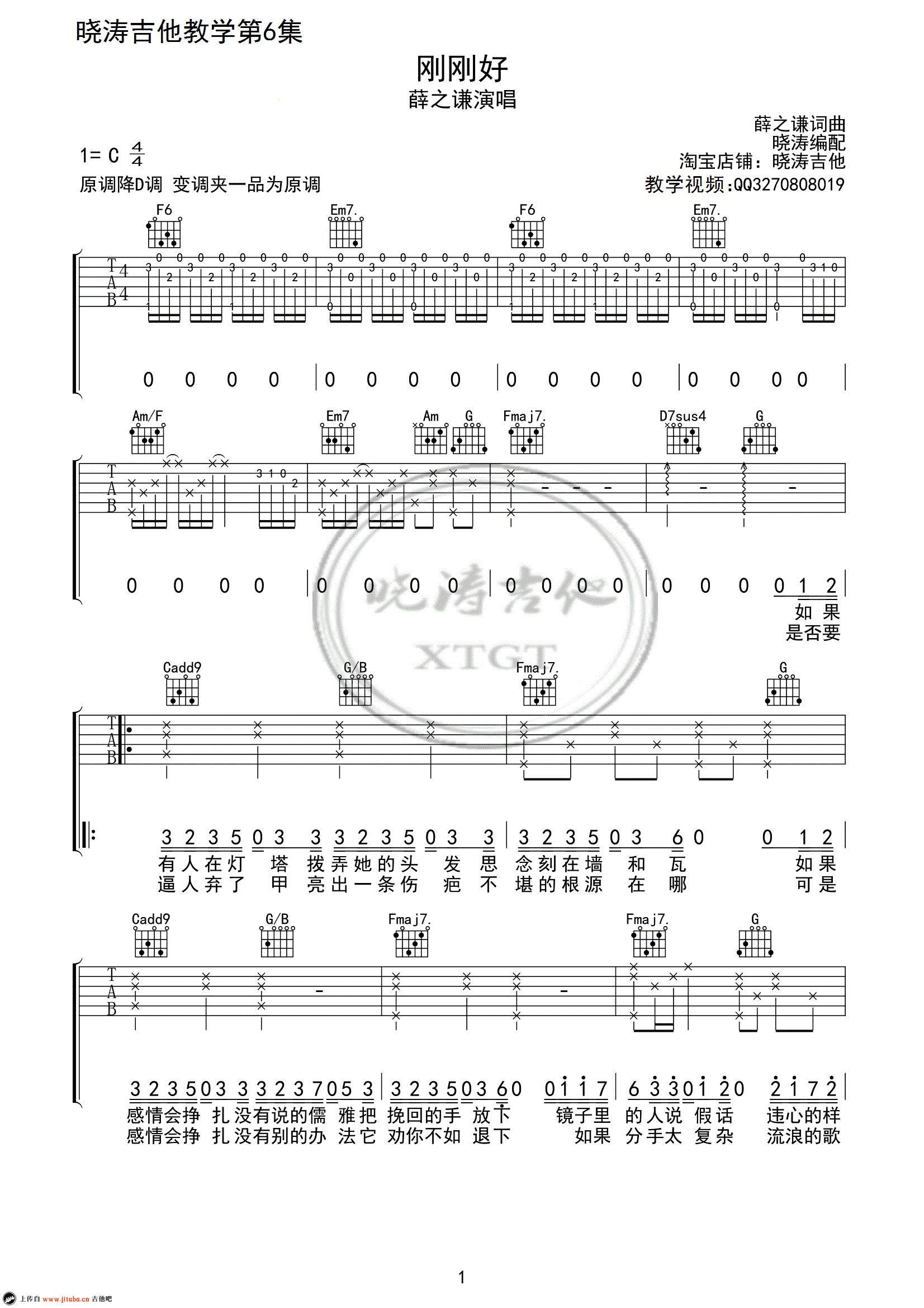 曲谱介绍: 薛之谦《刚刚好》吉他谱,歌曲原调是降D调,变调夹夹一品,选用C调指法。刚刚好六线谱,高清弹唱谱共三张图片谱例,感谢晓涛吉他编配制谱。刚刚好是薛之谦词曲创作的一首抒情慢板情歌,旋律优美歌词伤感,唱出男人面临分手的勇敢和不舍的复杂情绪。
