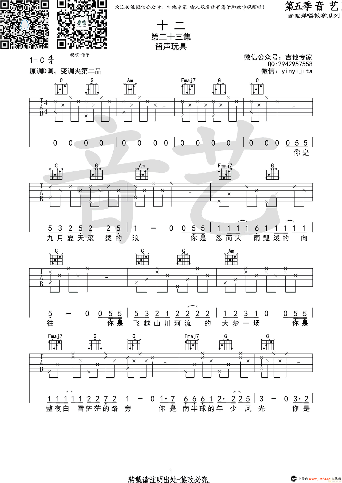 曲谱介绍: 留声玩具《十二》六线谱,原调D,C调指法编配,变调夹夹第二品。十二吉他谱,原版高清弹唱谱,四张图片两页显示。