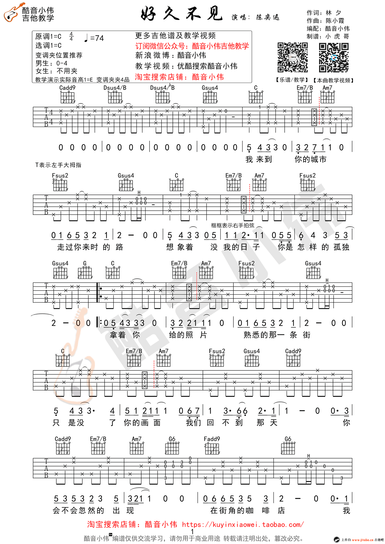 曲谱介绍: 陈奕迅《好久不见》吉他谱,C调弹唱谱进阶版,好久不见吉他六线谱,高清版两张图片谱例。 曲谱由酷音小伟改编,并为琴友们带来吉他弹唱教学视频,大家认真学习老师的讲解示范学习,相信能够很快掌握学会这首经典的歌曲。