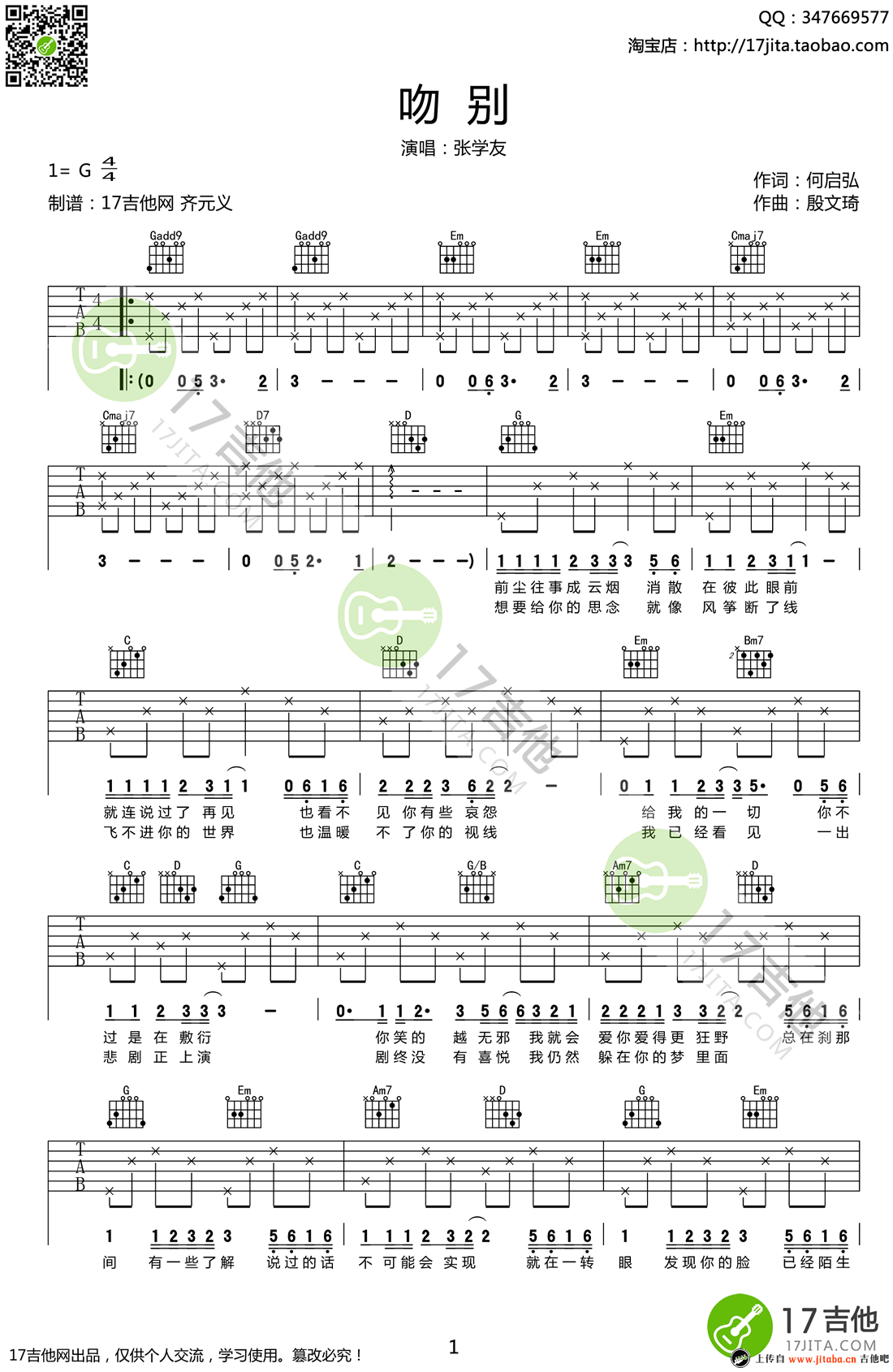 吻别吉他谱 - 张学友 - 吉他弹唱谱