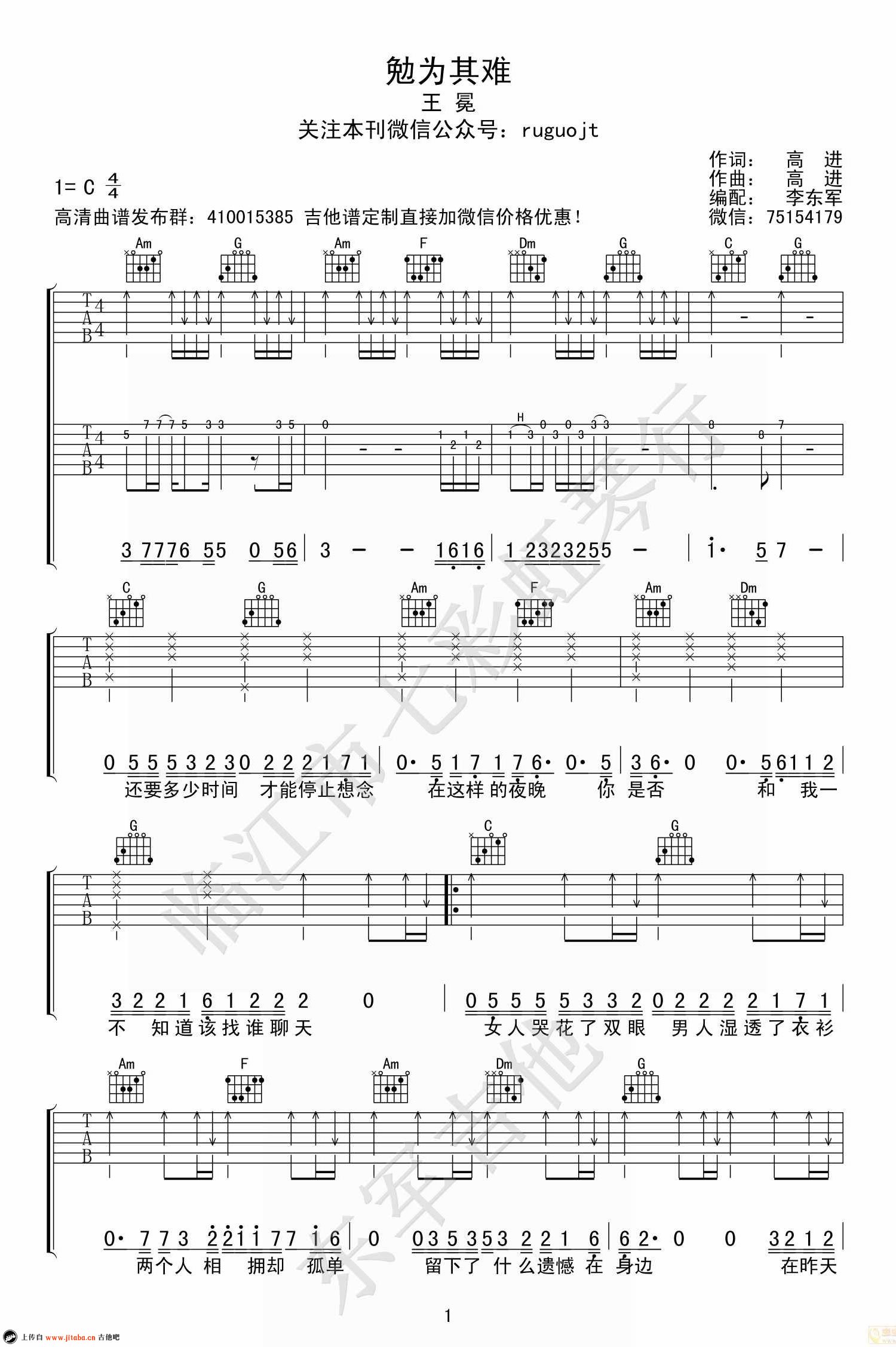 曲谱介绍: 王冕《勉为其难》吉他谱,C调指法,高清版六线谱,勉为其难吉他弹唱谱,高进词曲的一首好听的网络歌曲,临江七彩虹琴行编配出品,91吉他谱网站上传。