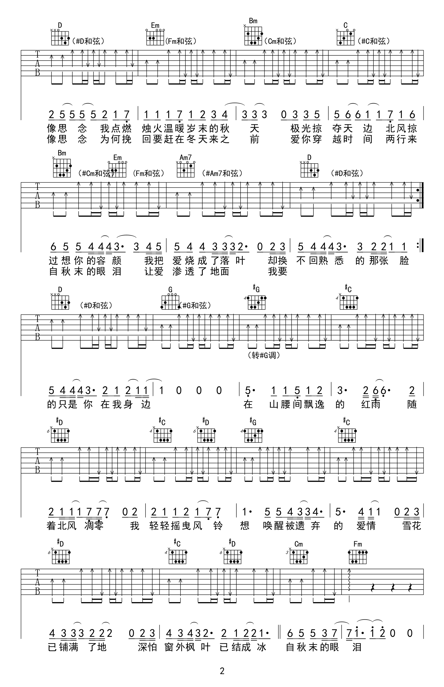 曲谱介绍: 枫吉他谱,周杰伦演唱的一首老歌,歌曲原调C,选G调编配,带前奏完美版,带转调横按和弦,枫六线谱,高清弹唱谱,共三张图片谱。感谢又又吉他编配分享。 《枫》的词曲有着浓郁的深秋意味,唱出了阴沉、悲伤的情绪。周杰伦飙高音的地方让人惊叹。缓缓飘落的枫叶像思念..