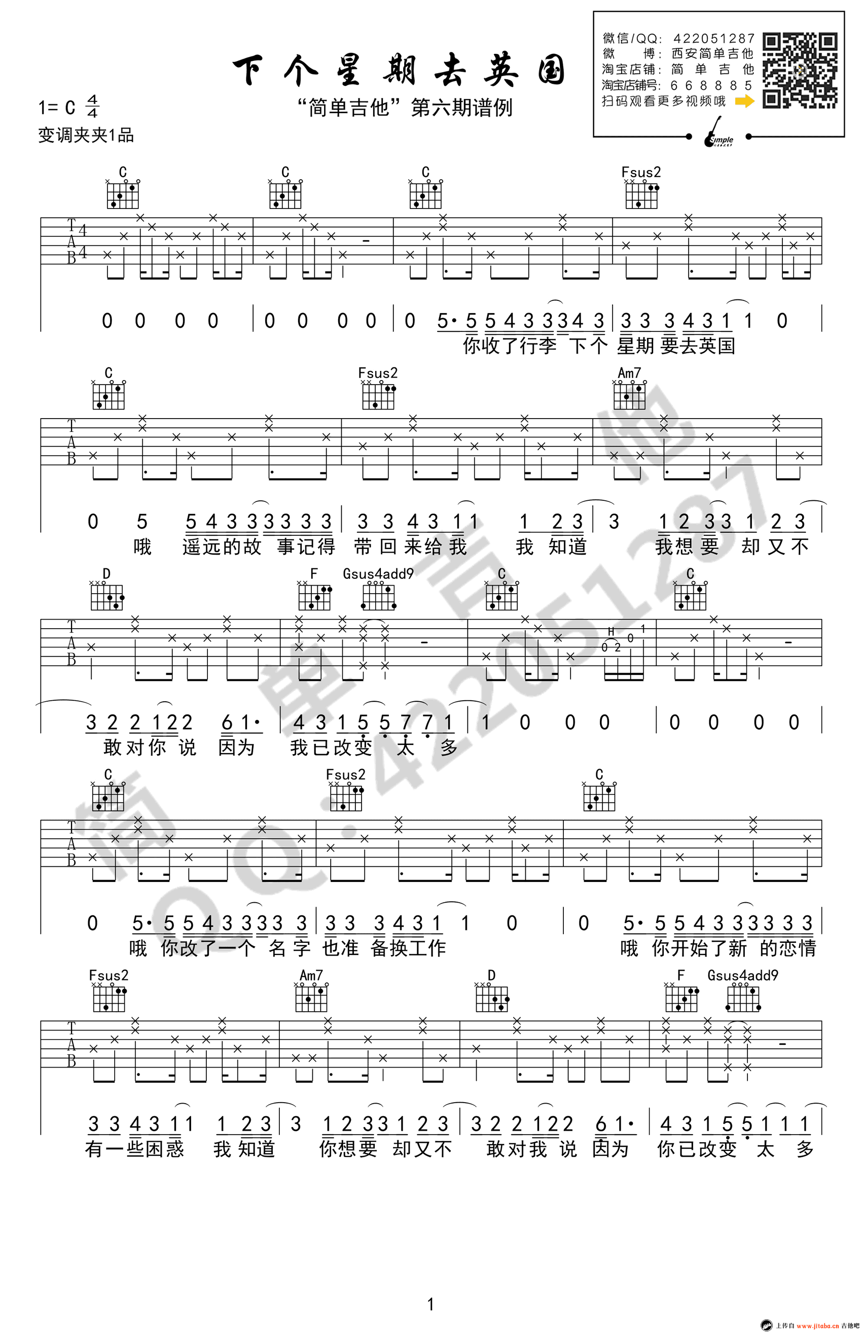 曲谱介绍: 陈绮贞《下个星期去英国》吉他谱,C调弹唱谱,变调夹夹一品,简单吉他编配。下个星期去英国六线谱,图片谱高清版本,91吉他谱上传分享。 简单的歌词和旋律,加上苏苏清新的嗓音,仿佛歌里故事就发生在你我身边。陈绮贞的歌声总会让人觉得世界是一团温柔的水。我看着你成长,看着你离别,看着你走向新的世界——其实只是朝着不在预知里的方向旅行而已。