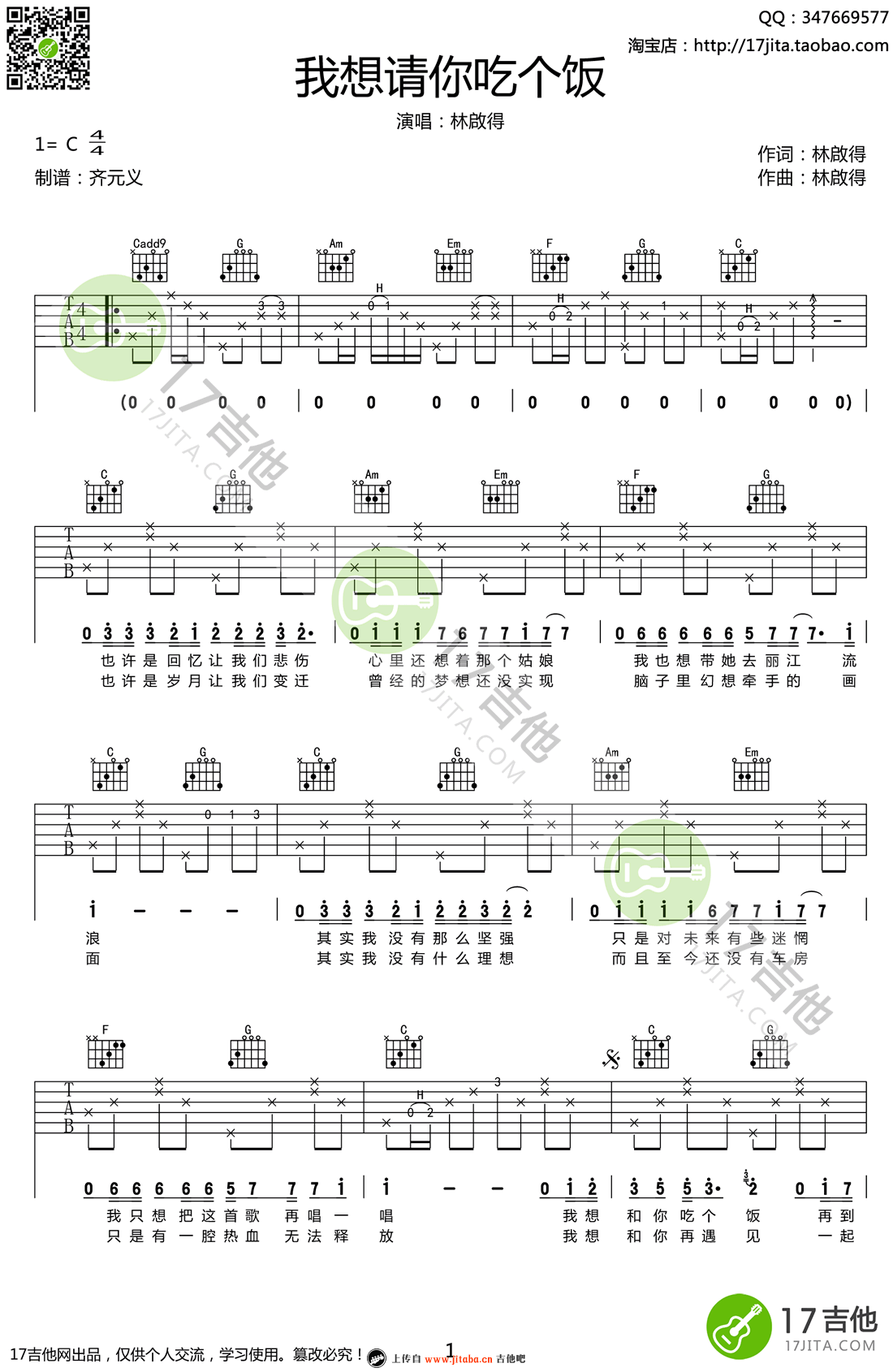 曲谱介绍: 林啟得《我想和你吃个饭》吉他谱,C调弹唱谱高清版,两张图片谱例。一首好听的民谣歌曲,由林啟得词曲原创。收录于《唔的声音》专辑。