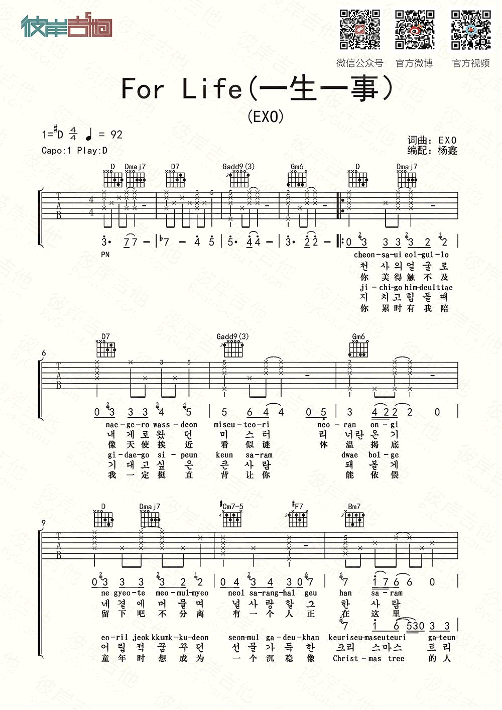 曲谱介绍: For Life吉他谱,EXO演唱的《一生一事》吉他谱,中文版弹唱,六线谱编配,共五张图片谱。原调#D变调夹夹1品,选用D的指法。 曲谱exo的一生一事(for life)标注中文和韩文版的歌词,喜欢这首歌曲的琴友们可以参考视频弹唱示范练习。