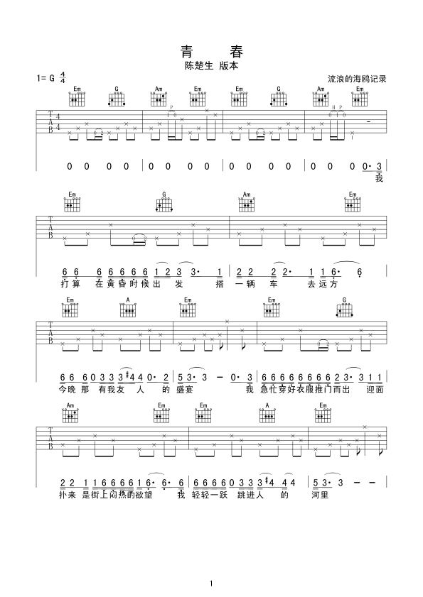曲谱介绍: 《青春》吉他弹唱谱,共有2张高清图谱,免翻页排版设计。