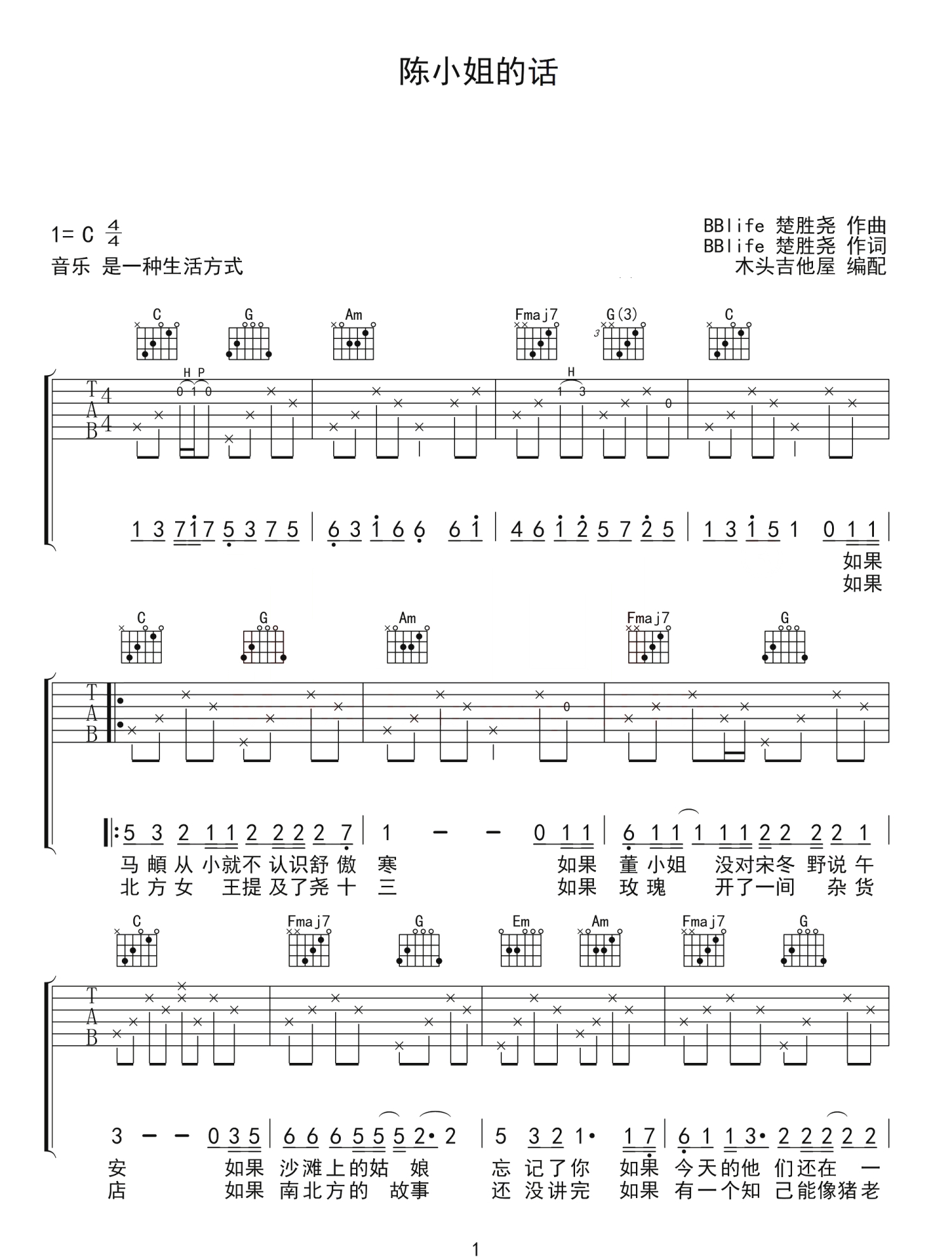 陈小姐的话吉他谱 - 楚胜尧 - C调吉他弹唱谱