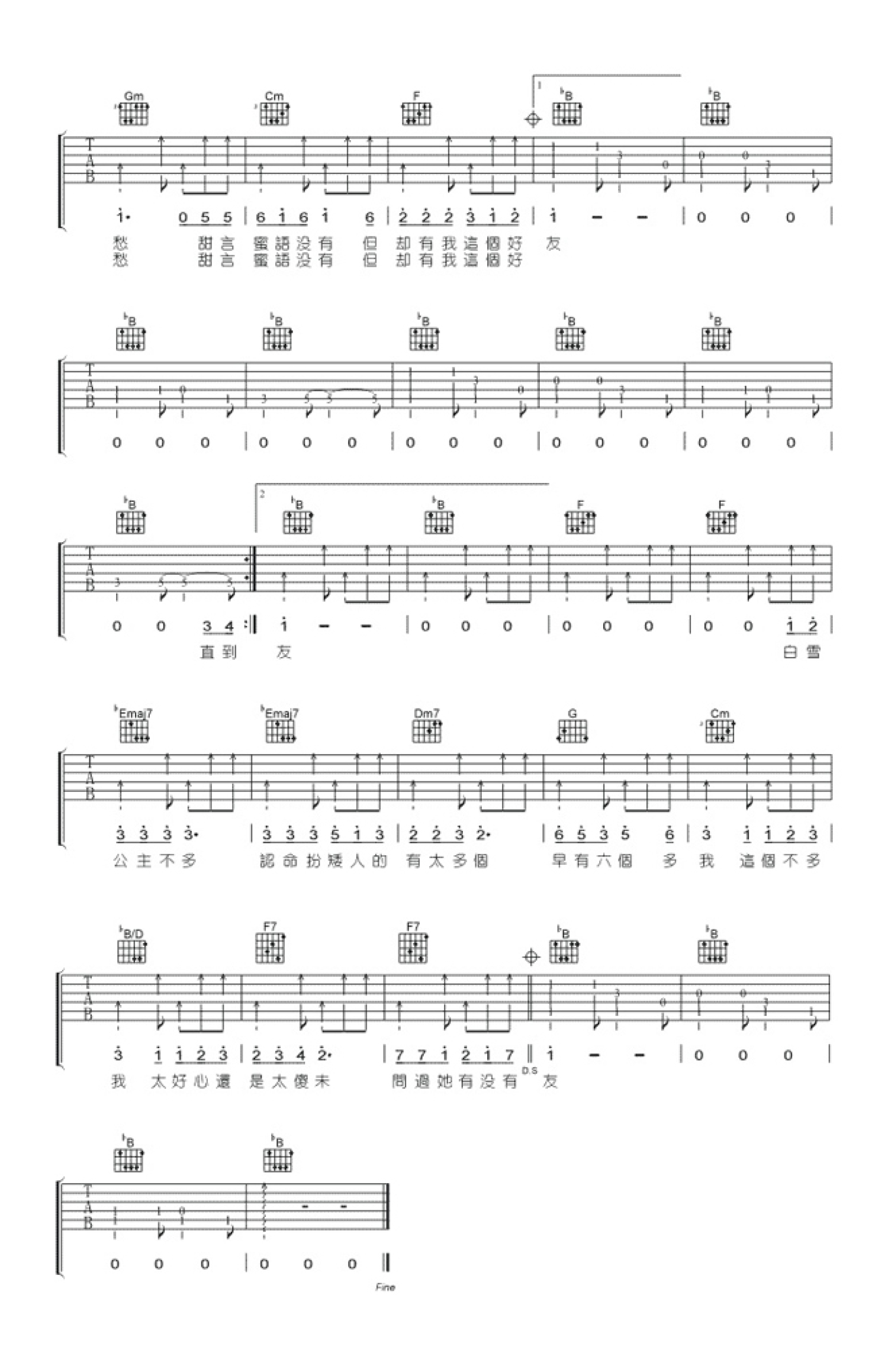 曲谱介绍: 梁汉文七友是一首抒情粤语歌曲,忧伤动听旋律配上林夕的作词,唱出全心全力地去安慰心里爱恋的友人走出失恋,而自己内心的爱却无法诉说的痛楚心情。七友吉他谱选用Bb调,六线图片谱共两张,琴友们可以参考练习弹唱。