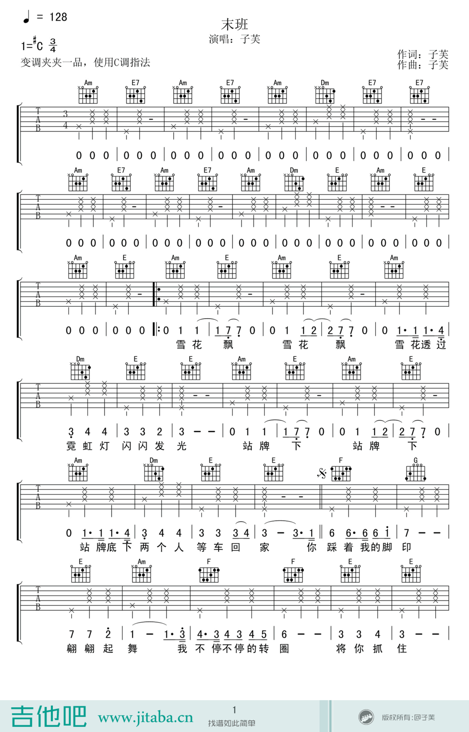 末班吉他谱 - 子芙 - C调吉他弹唱谱