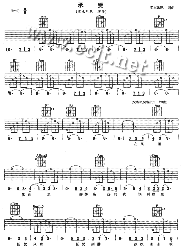 曲谱介绍: 《承受》吉他弹唱谱,共有2张高清图谱,免翻页排版设计。