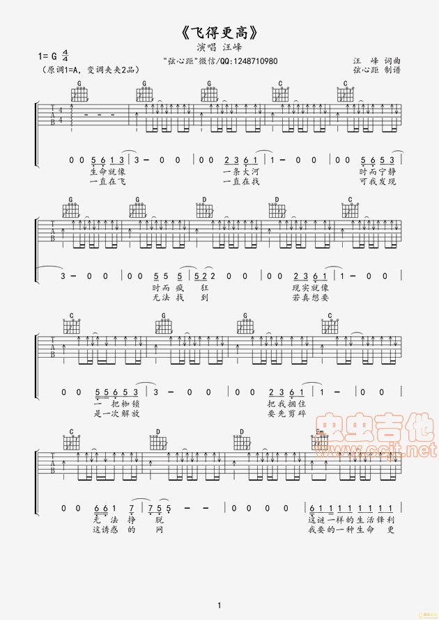曲谱介绍: 弦心距音乐《飞得更高》吉他弹唱谱,共有2张高清图谱,免翻页排版设计。