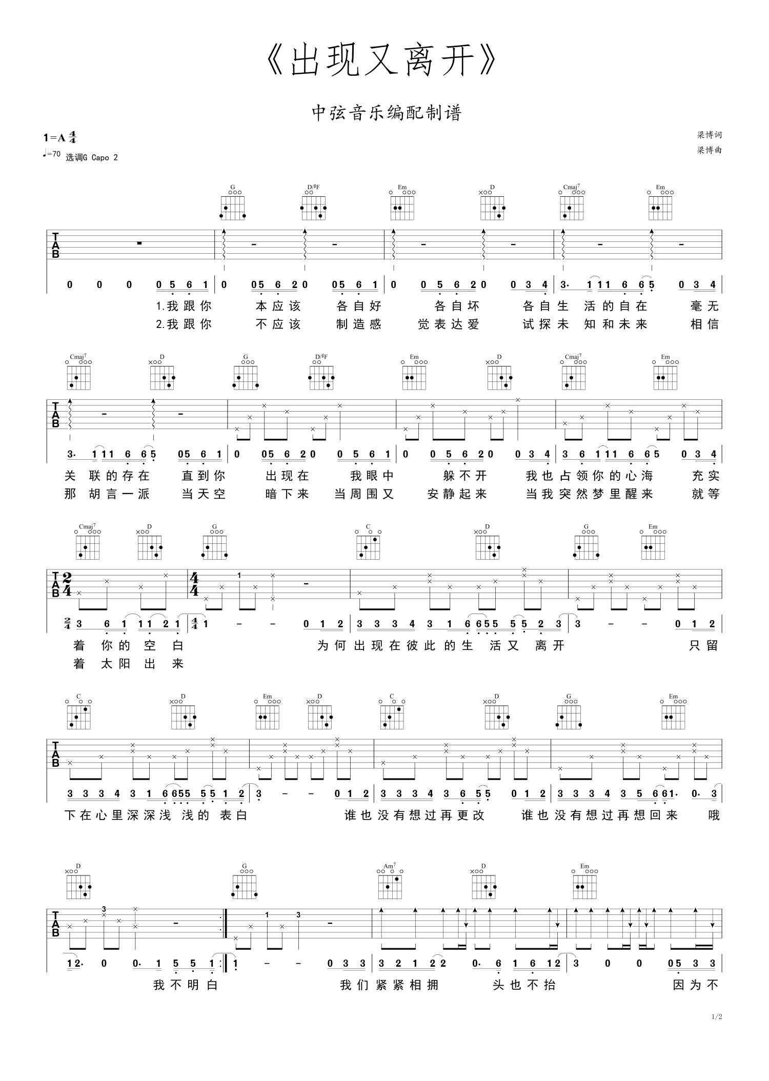 曲谱介绍: 梁博《出现又离开》吉他谱_G调吉他弹唱谱