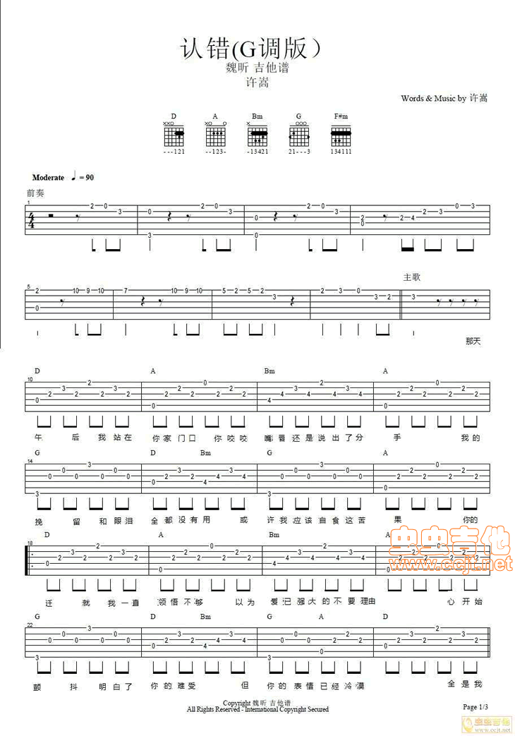 认错(G调完美版)吉他谱 - G调吉他弹唱谱