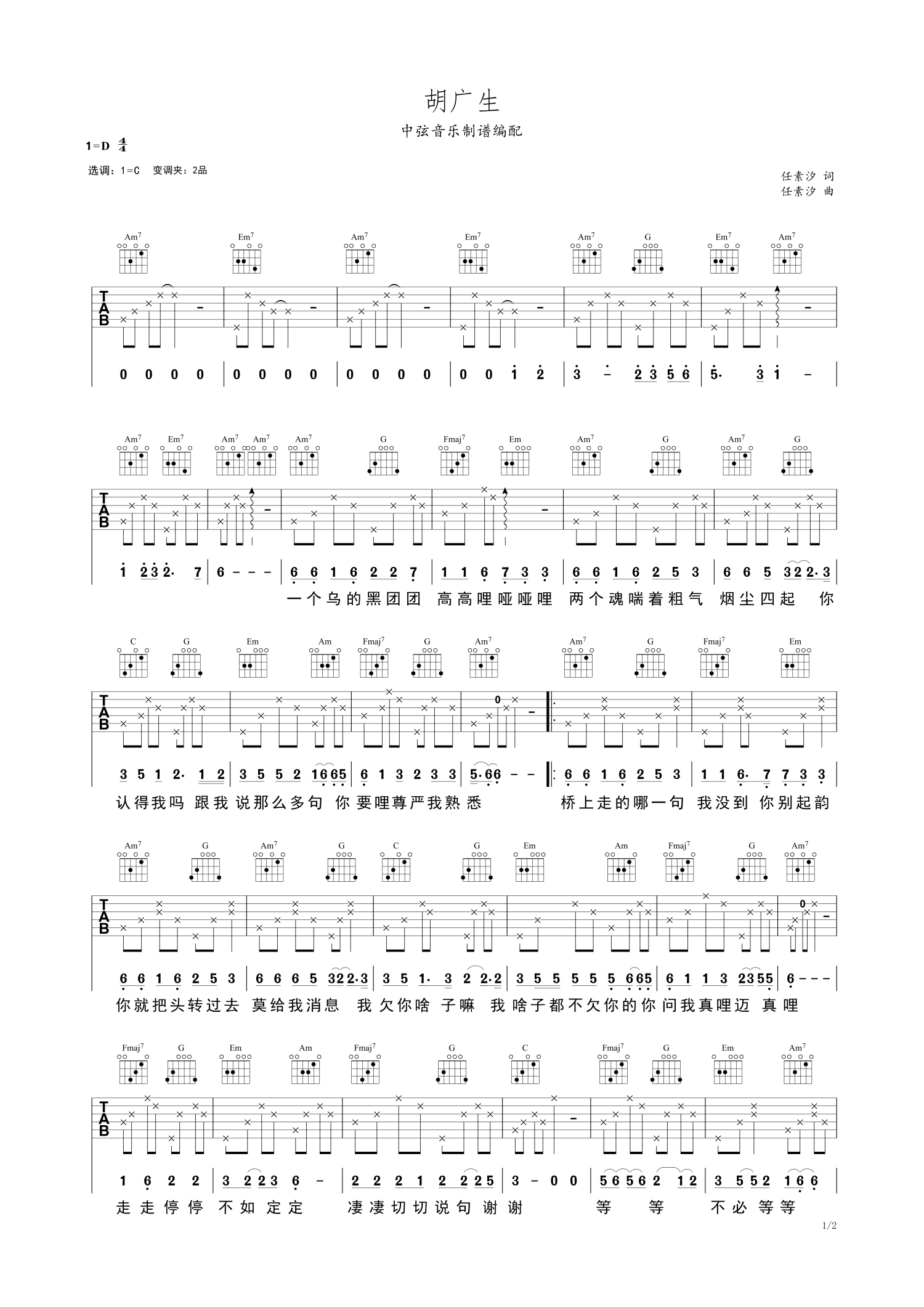 • 胡广生吉他谱 - 任素汐 - C调吉他弹唱谱第1张