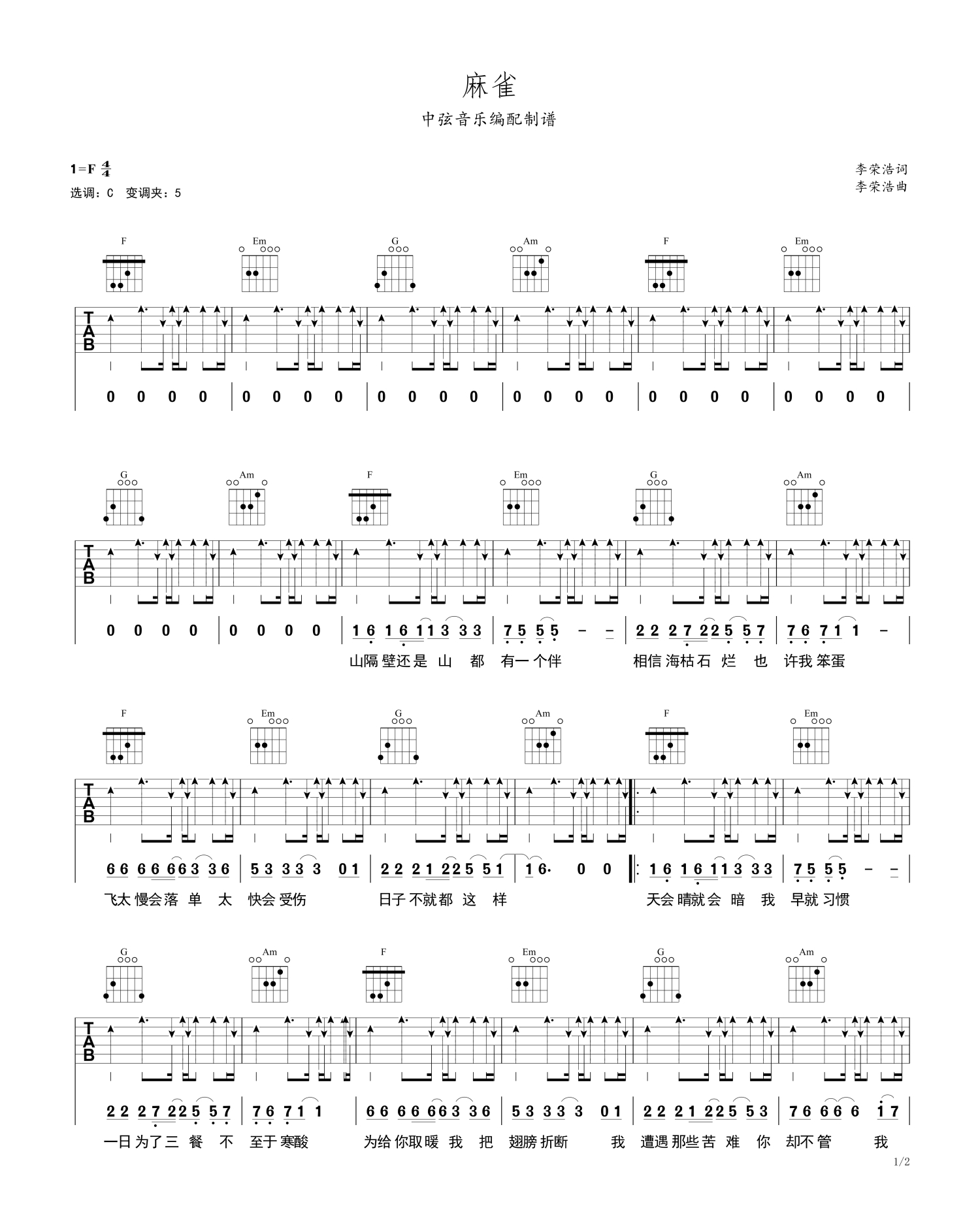 • 麻雀吉他谱 - 李荣浩 - C调吉他弹唱谱第1张