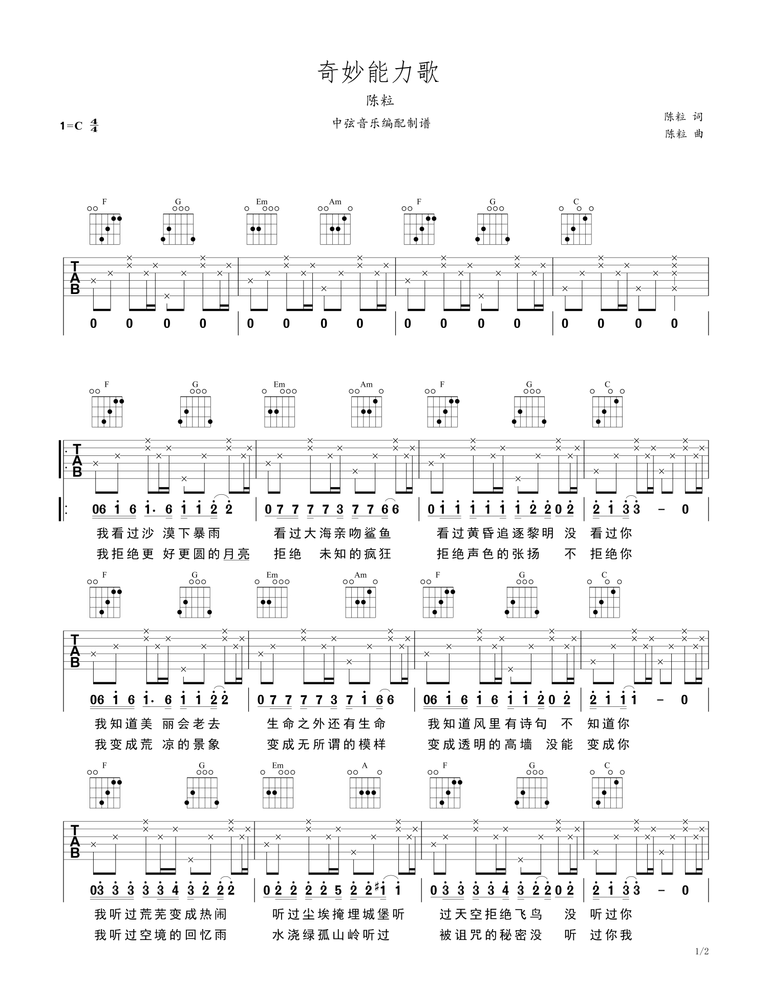 • 奇妙能力歌吉他谱 - 陈粒 - C调吉他弹唱谱第1张