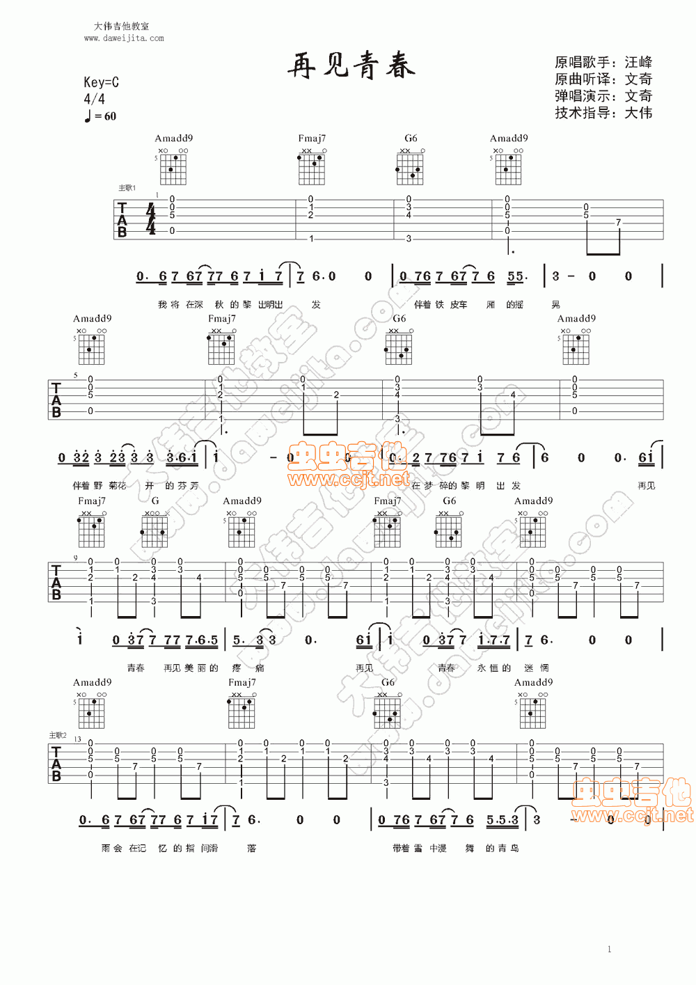 曲谱介绍: 汪峰《再见青春》吉他弹唱谱,共有4张高清图谱。