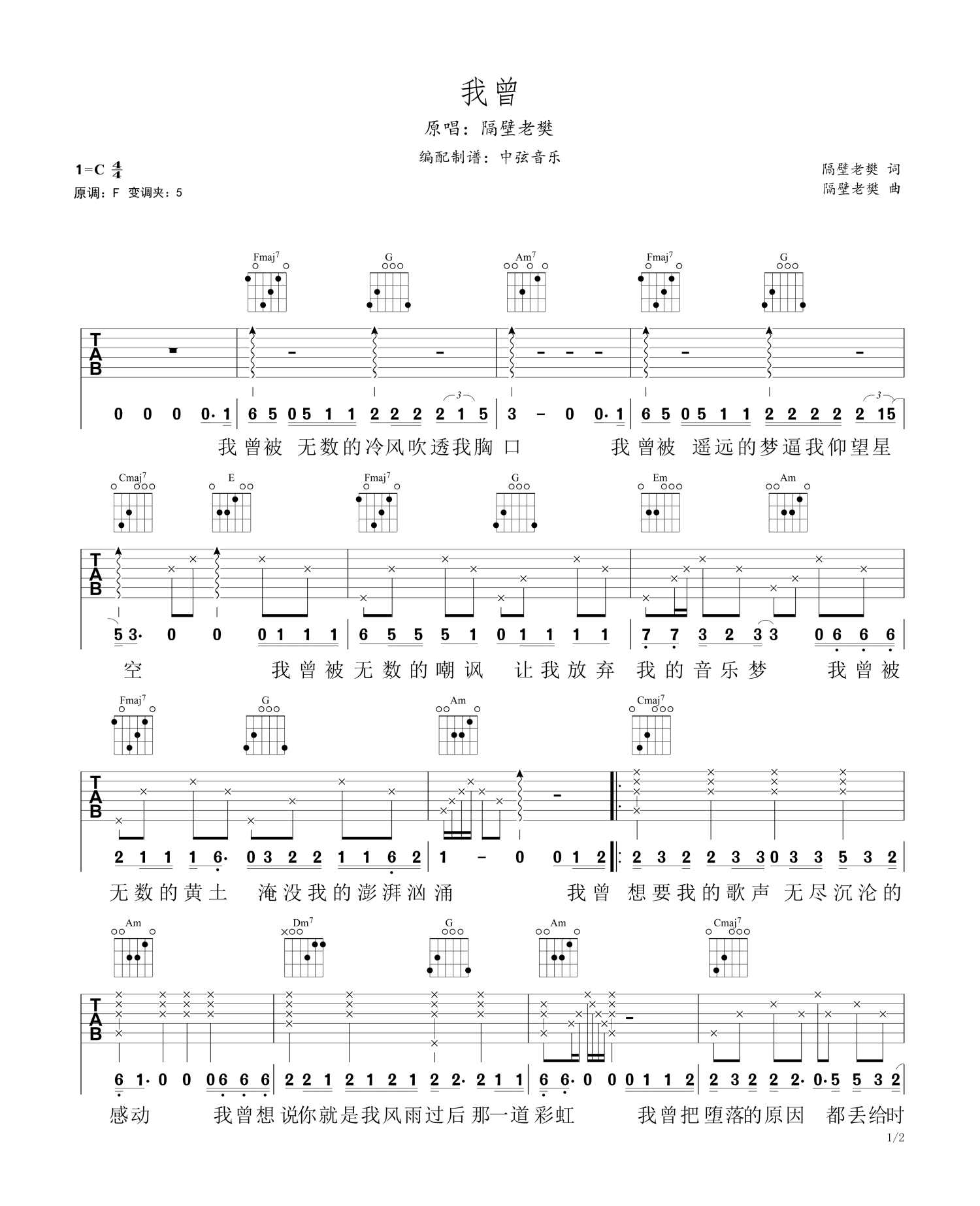 • 我曾吉他谱 - 隔壁老樊 - C调吉他弹唱谱第1张
