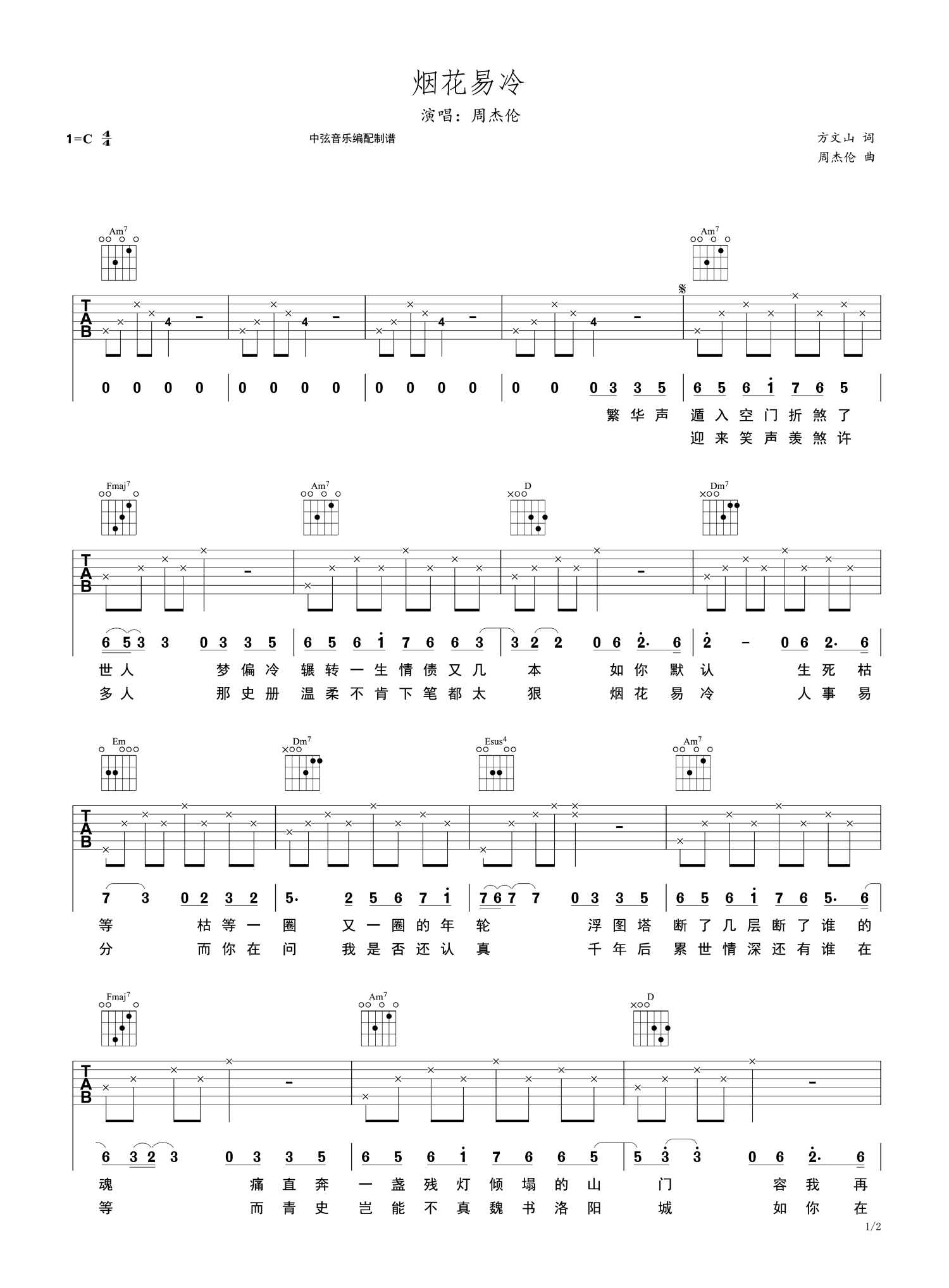 • 烟花易冷吉他谱 - 周杰伦 - C调吉他弹唱谱第1张