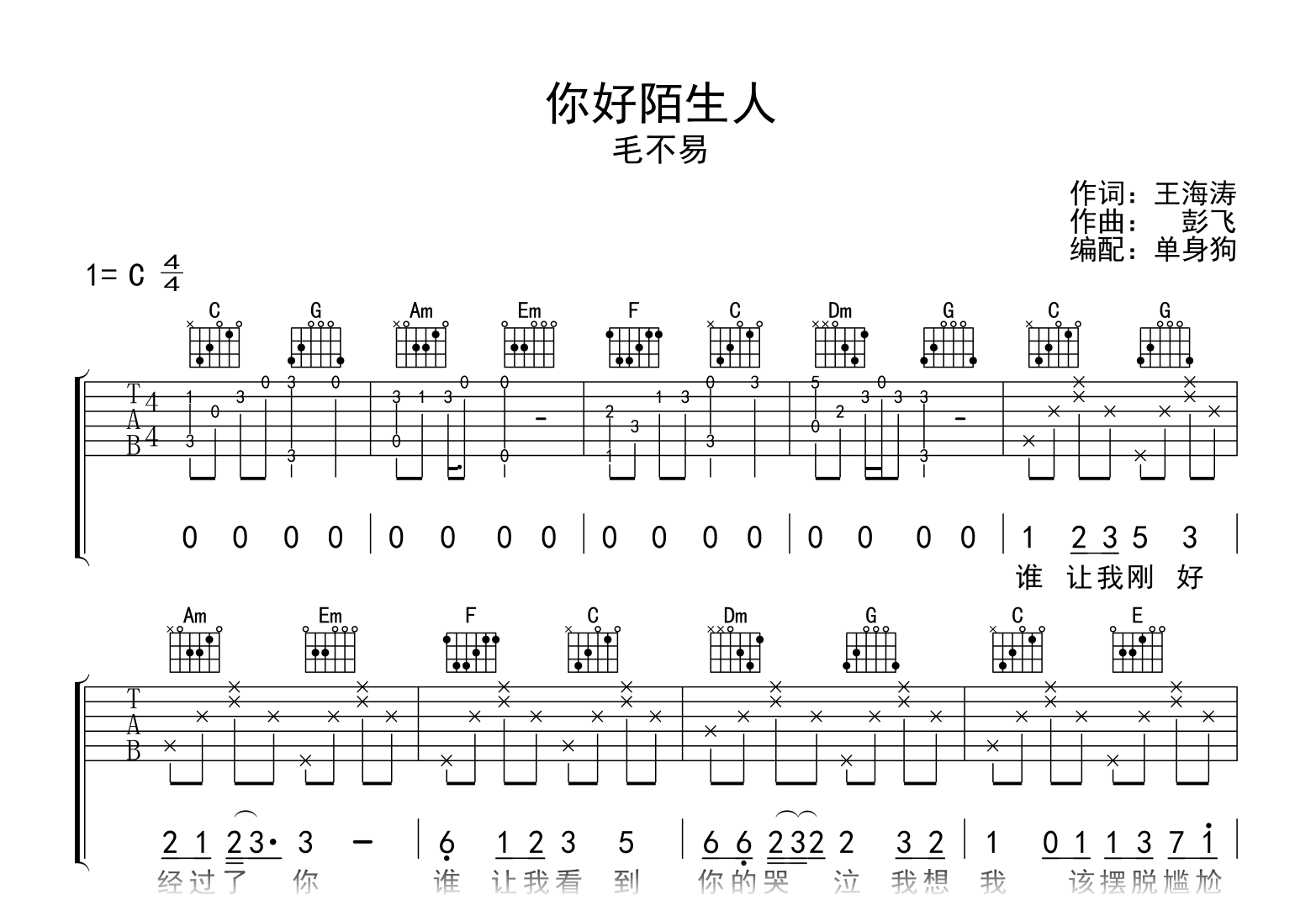你好陌生人吉他谱 - 毛不易 - C调吉他弹唱谱