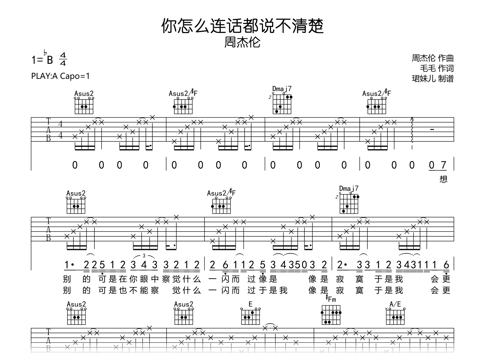 曲谱介绍: 你怎么连话都说不清楚吉他谱,周杰伦给蔡依林写的一首经典老歌,《你怎么连话都说不清楚》吉他弹唱谱,原调降B,选用C调和弦指法,建议变调夹1品,演奏速度85BPM,难度较简单易上手。 你怎么连话都说不清楚,那温柔的痛我记得清楚。这首给jolin的,杰伦有自己唱过live。从前奏的吉他loop就好喜欢,轻轻缓缓的,早期的风格,随便哼哼都好听。