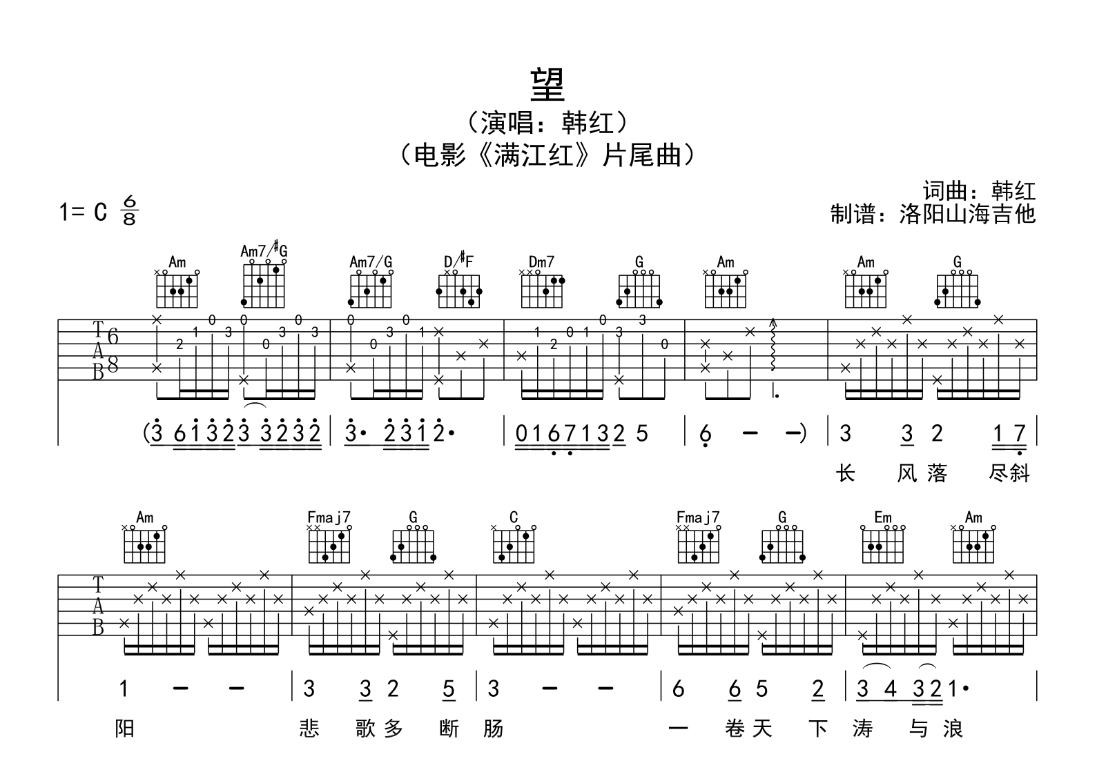 曲谱介绍: 望吉他谱,韩红演唱,热映电影《满江红》片尾曲。回望过往,眺望远方。《望》吉他弹唱谱,选用C调和弦指法,完整编配共三张高清图片谱。 深挚歌声与影片中极具撼动的画面让人动容,唱尽人生悲欢离合,歌颂英雄赤胆忠良,一词一句扣人心弦,绵长思绪在婉转曲调中藏匿。