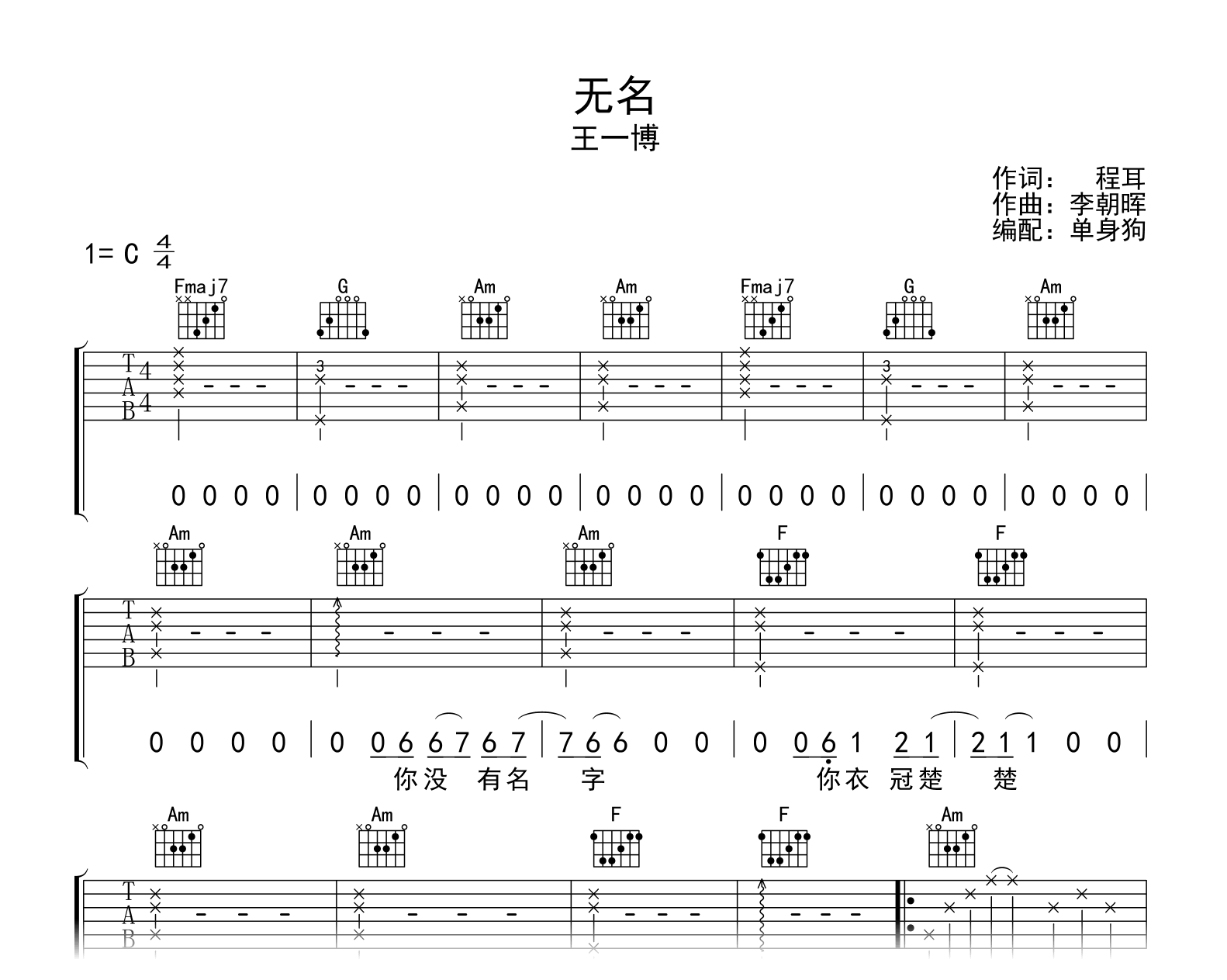 无名吉他谱 - 王一博 - C调吉他弹唱谱