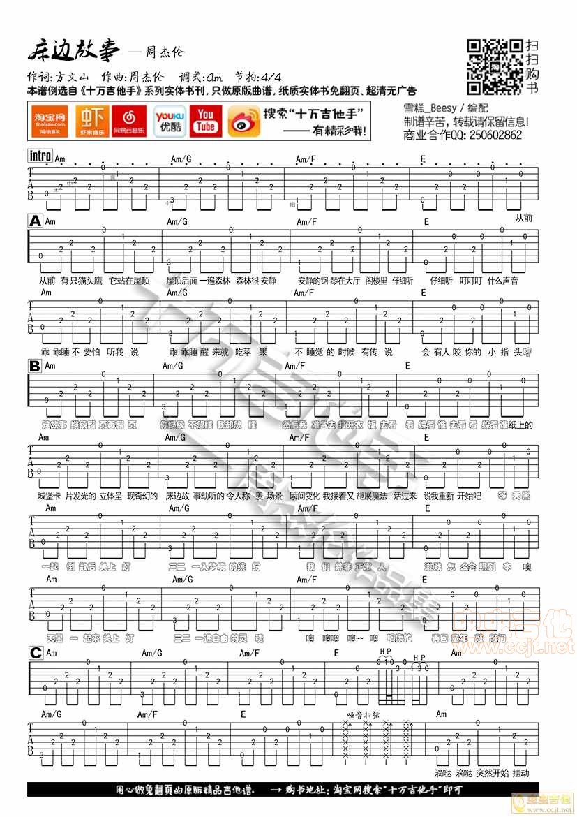曲谱介绍: 《床边故事》吉他弹唱谱,共有2张高清图谱,免翻页排版设计。