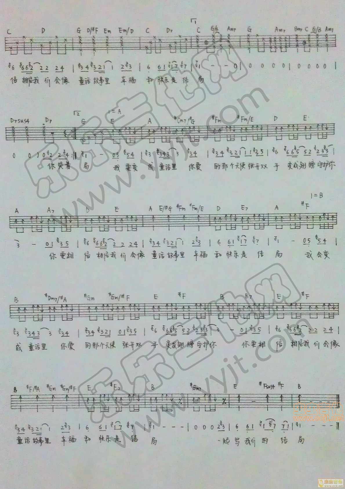 曲谱介绍: 光良|《童话》吉他弹唱谱,共有2张高清图谱,免翻页排版设计。