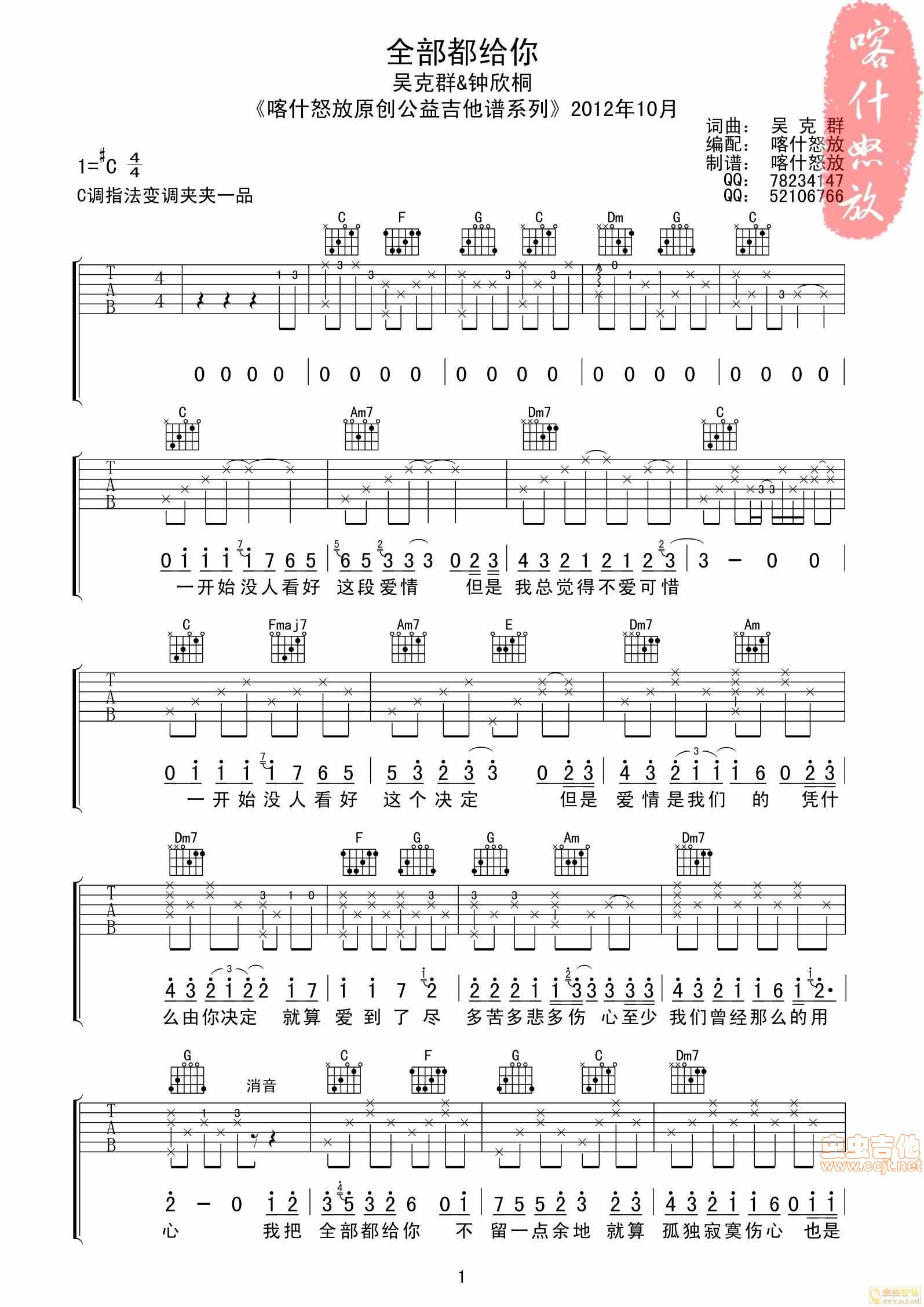 吴克群&钟欣桐 全部都给你 喀什怒放全网首发吉他谱 - 吴克群&钟欣桐 - 吉他弹唱谱